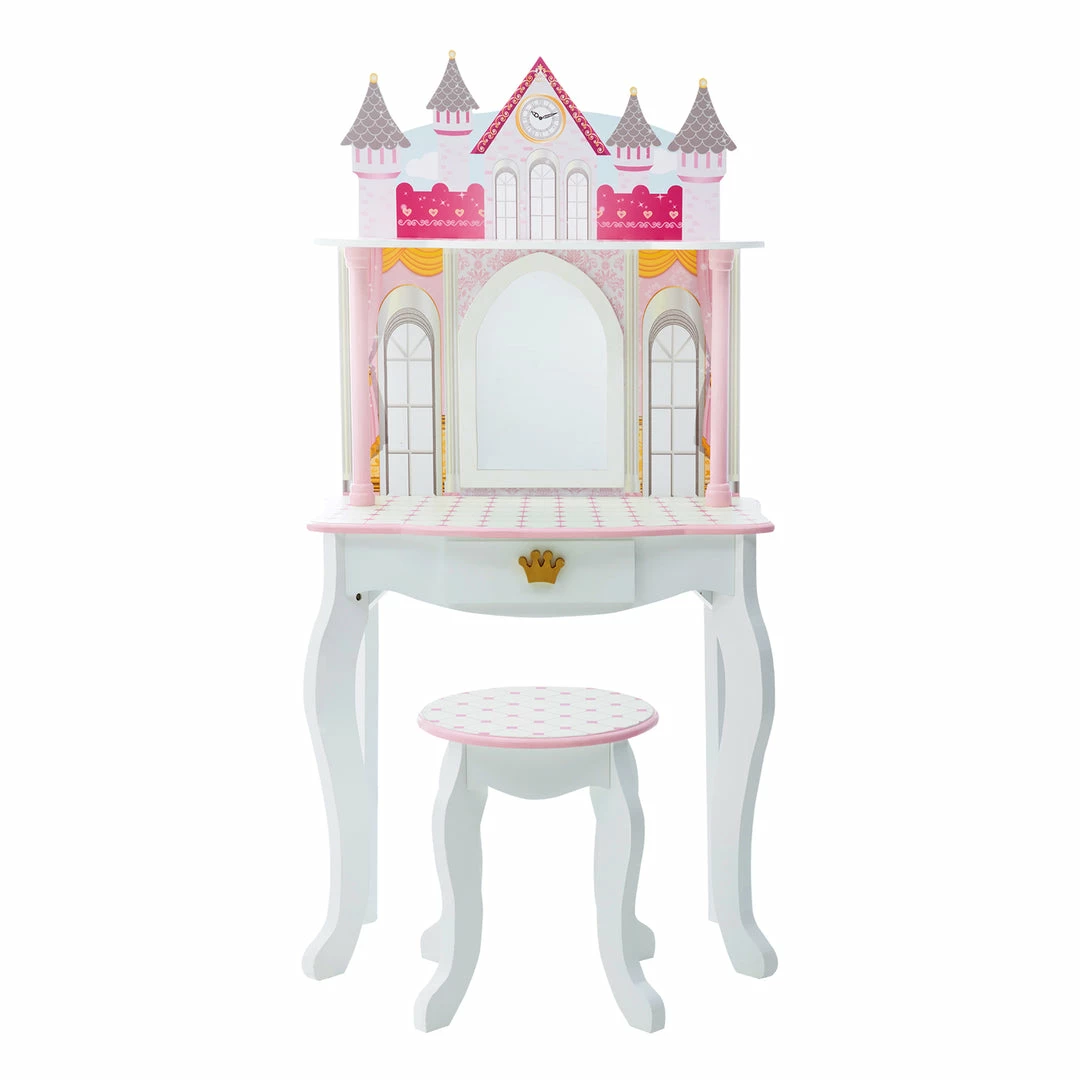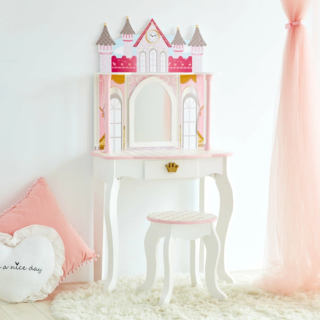TeamsonUS Fantasy Fields Kids Dreamland Castle Vanity Set With Chair And Accessories, White/Pink