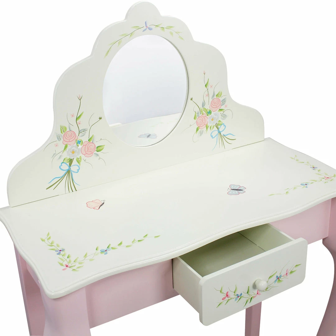Vibrant, pink, and white, and girlie all over! The Bouquet Vanity Table and Stool Set is the perfect place to make her dress-up dreams a reality. Equipped with storage and a mirror, this make-believe makeup vanity for children is entertaining, fosters creativity, and encourages safe play. Made from solid wood, this durable pink and white vanity and stool are suitable for children 3 years and older.