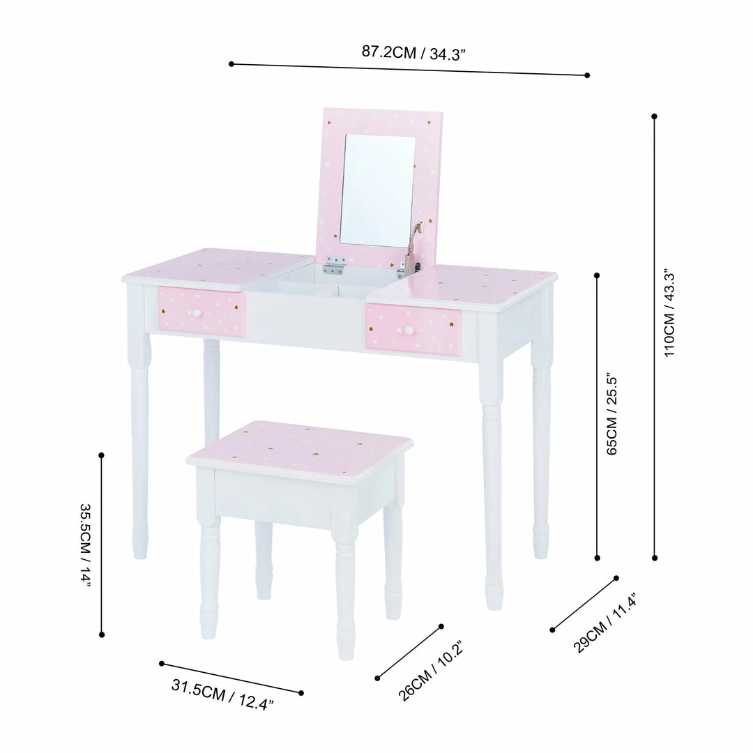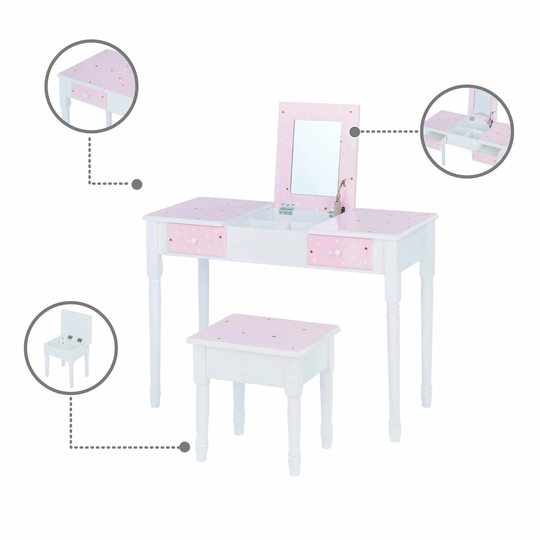 - KIDS VANITY SET: Features a pink and white design decorated with star details for a fun and functional addition to your child’s bedroom or play area