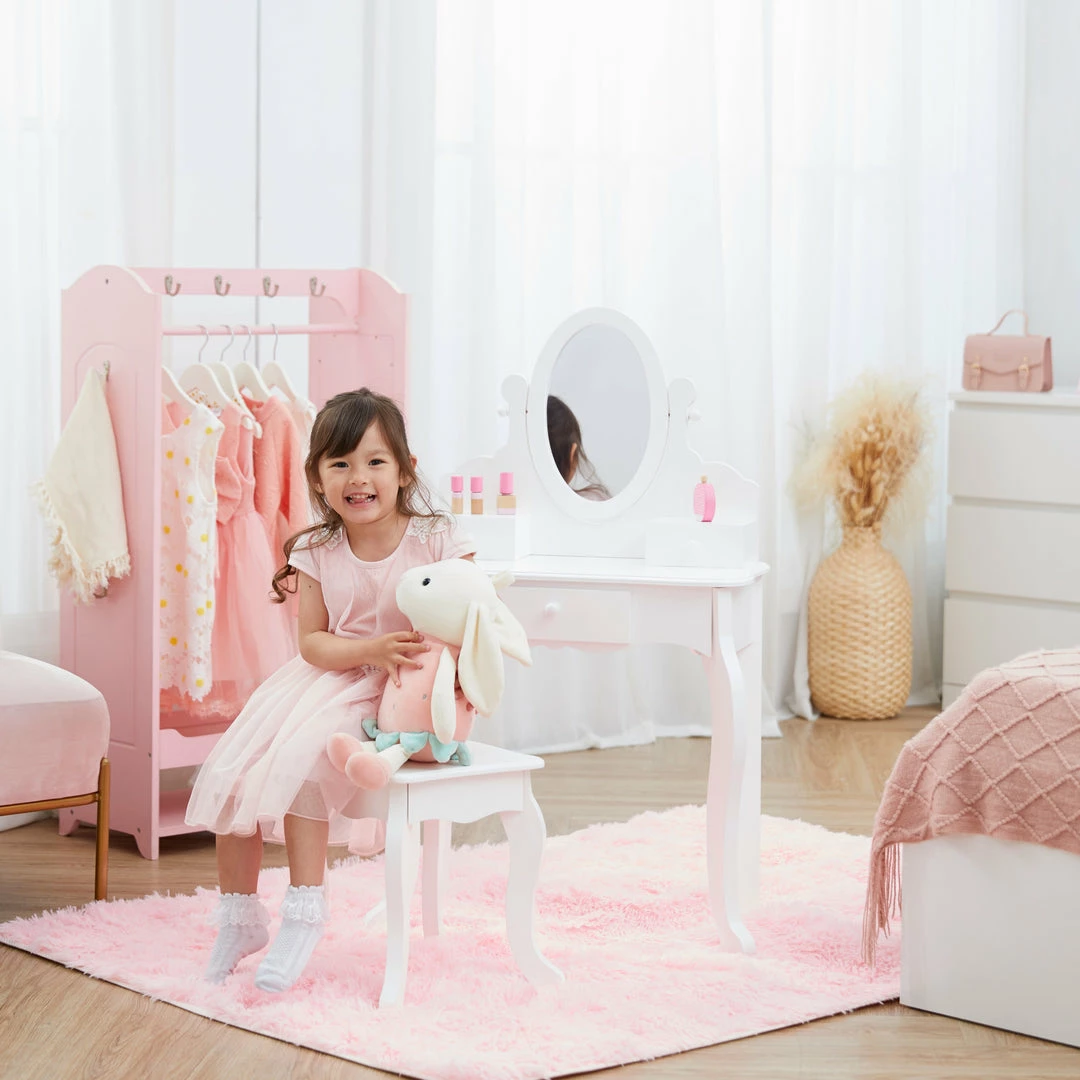 Give your little one an elegant place to get ready with the Fantasy Fields by Teamson Kids Little Princess Rapunzel Vanity Table with Stool. This vanity set features a scalloped design in a classic white finish for a fun and functional addition to your child’s bedroom or play area. This kids vanity set includes a pivot mirror and coordinating stool to make getting ready easy. The three built-in drawers provide plenty of storage space for makeup, brushes, jewelry, and other accessories. The durable MDF construction with rounded corners is kid-safe and easy to wipe clean from every day messes, and the unbreakable plexiglass mirror provides better reflection and long-lasting use. The easy-to-follow instructions allow for quick adult assembly so playtime can start right away. This kid-sized vanity table measures 23.75″ long, 12″ deep, and 38.75″ tall and the stool measures 11.75″ long, 10.75″ deep, and 14″ tall to fit in any playroom. Recommended for children ages 3 years and up.