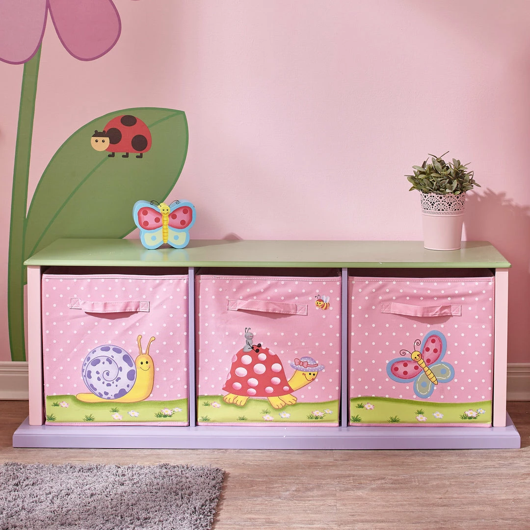 - KIDS STORAGE BENCH: Decorated with a magical forest display featuring flowers and friendly forest creatures for a whimsical playroom storage solution