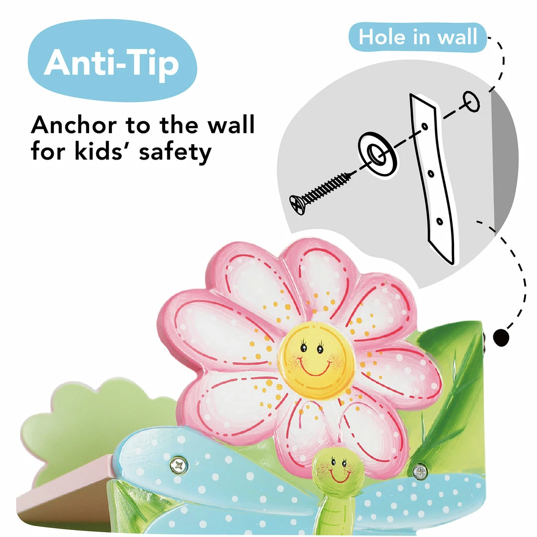 Brighten your child’s play area while keeping it organized and clutter-free with the Fantasy Fields by Teamson Kids Magic Garden Kids Wooden Bookshelf with Storage Drawers. This colorful wooden shelving unit comes decorated with a magical forest display featuring flowers and friendly forest creatures for a whimsical playroom storage solution. The two bottom storage drawers pull out easily and contain ample space for your little one’s toys, craft supplies, clothes, and more, while the 3 shelves above keep books and other toys organized. Purchase this bookshelf on its own or with other items from the Magic Garden collection for a bright and joyful playroom. For quick and easy assembly, step-by-step instructions are included. With a solid design constructed of sturdy wood, this organizer is built to provide long-lasting use. For convenient upkeep, the storage shelf’s easy-to-clean surfaces make wiping up any spills a breeze. The Fantasy Fields by Teamson Kids Magic Garden Kids Wooden Bookshelf with Storage Drawers measures 22″ x 11.5″ x 38″ to fit in almost any bedroom or play area.