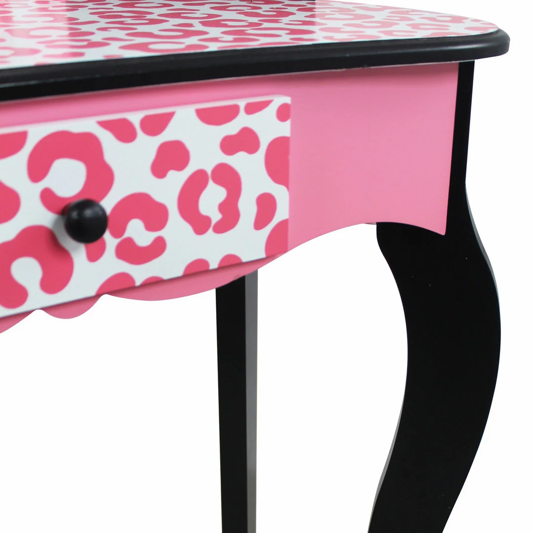 - KIDS VANITY SET: Features a pink and black design decorated with leopard print for a fun and functional addition to your child’s bedroom or play area