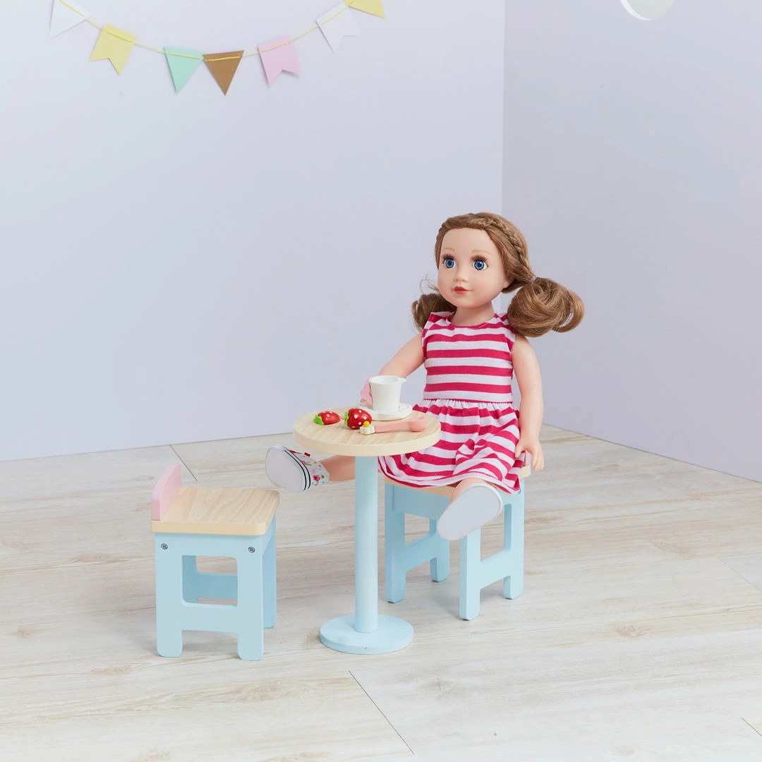 - 2 wooden chairs and a roundtable. Awesome place for the 18-inch dolls to have a juice a snack or an afternoon tea party with their friends!
