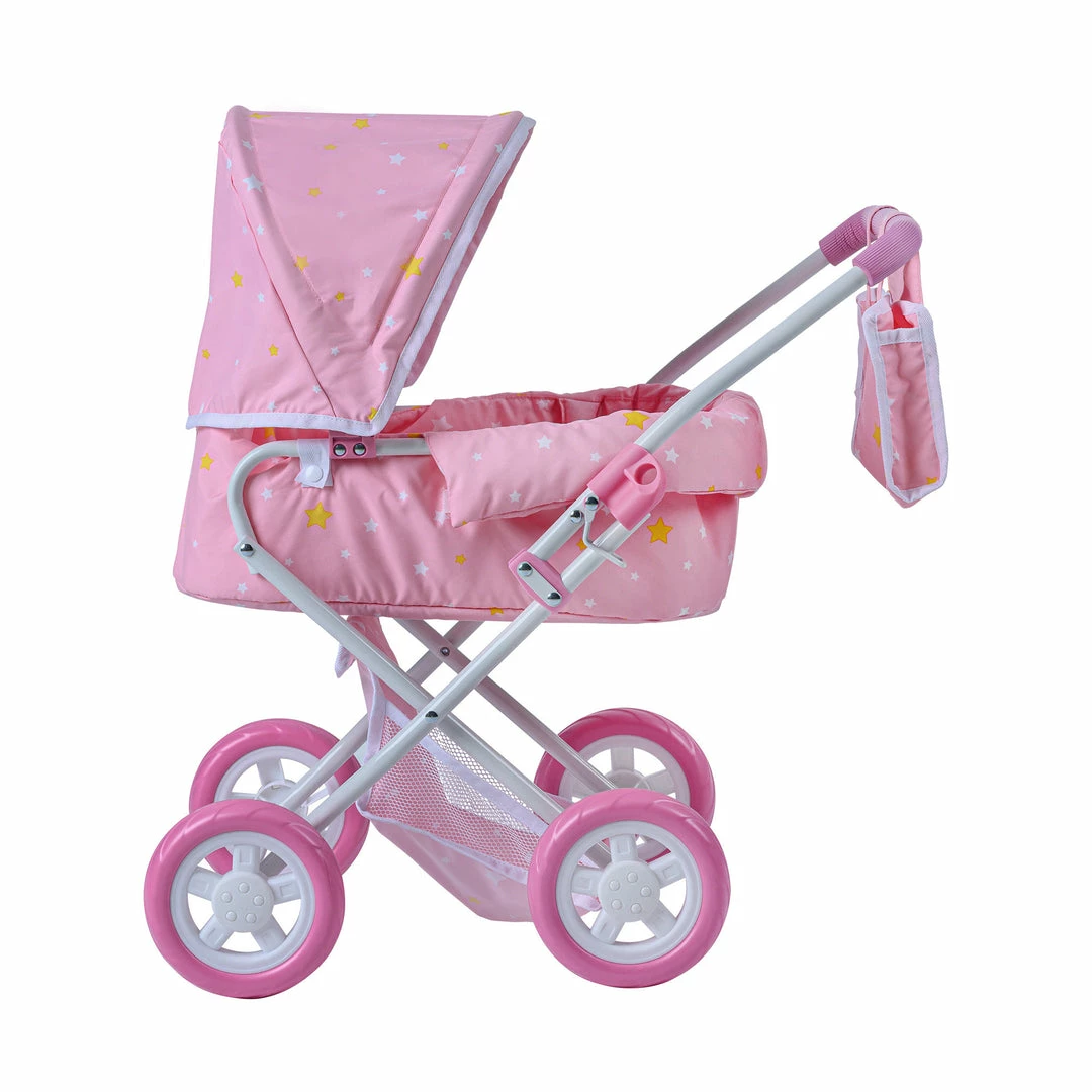 Keep your child’s dolls secure when on the go with the Olivia’s Little World Twinkle Stars Princess Deluxe Doll Stroller. This colorful baby doll stroller is features a pink seat and canopy covered in white and gold stars to keep your little one’s dolls and figurines protected from the elements while outdoors. The multiple configurations of this stroller functions both as a foldable stroller and as a hand baby carrier for versatile use. A large storage basket under the seat provides ample space for any bottles or other baby doll supplies to make playtime more convenient. The toy baby carrier’s foldable construction allows for quick setup and easy storage when playtime is over to avoid a cluttered play area. Add this baby doll stroller to your child’s toy collection alone or with other items from the Twinkle Star Princess collection to make playtime more magical. This durable stroller features large wheels for easy steering and is suitable for 16″ to 18″ dolls. Measuring just 22″ x 14.5″ x 26.75″, this toy stroller keeps your child’s dolls mobile without taking up too much space. The Olivia’s Little World Twinkle Stars Princess Deluxe Baby Doll Stroller is recommended for children ages 3 years and older.