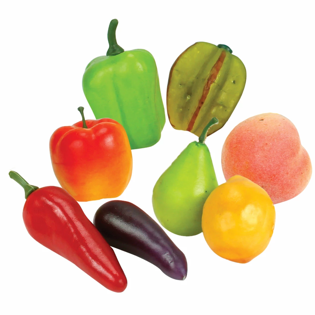- INCLUDED: This 14-piece set includes a grocery basket with handles, a box of cereal, a box of granola bars, a milk carton, banana, apple, orange, pear, lemon, peach, eggplant, chili pepper, green pepper, and star fruit.