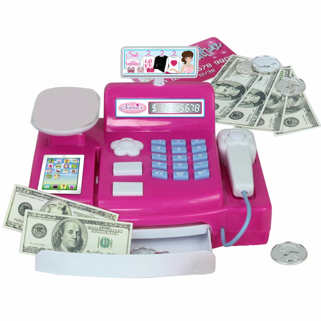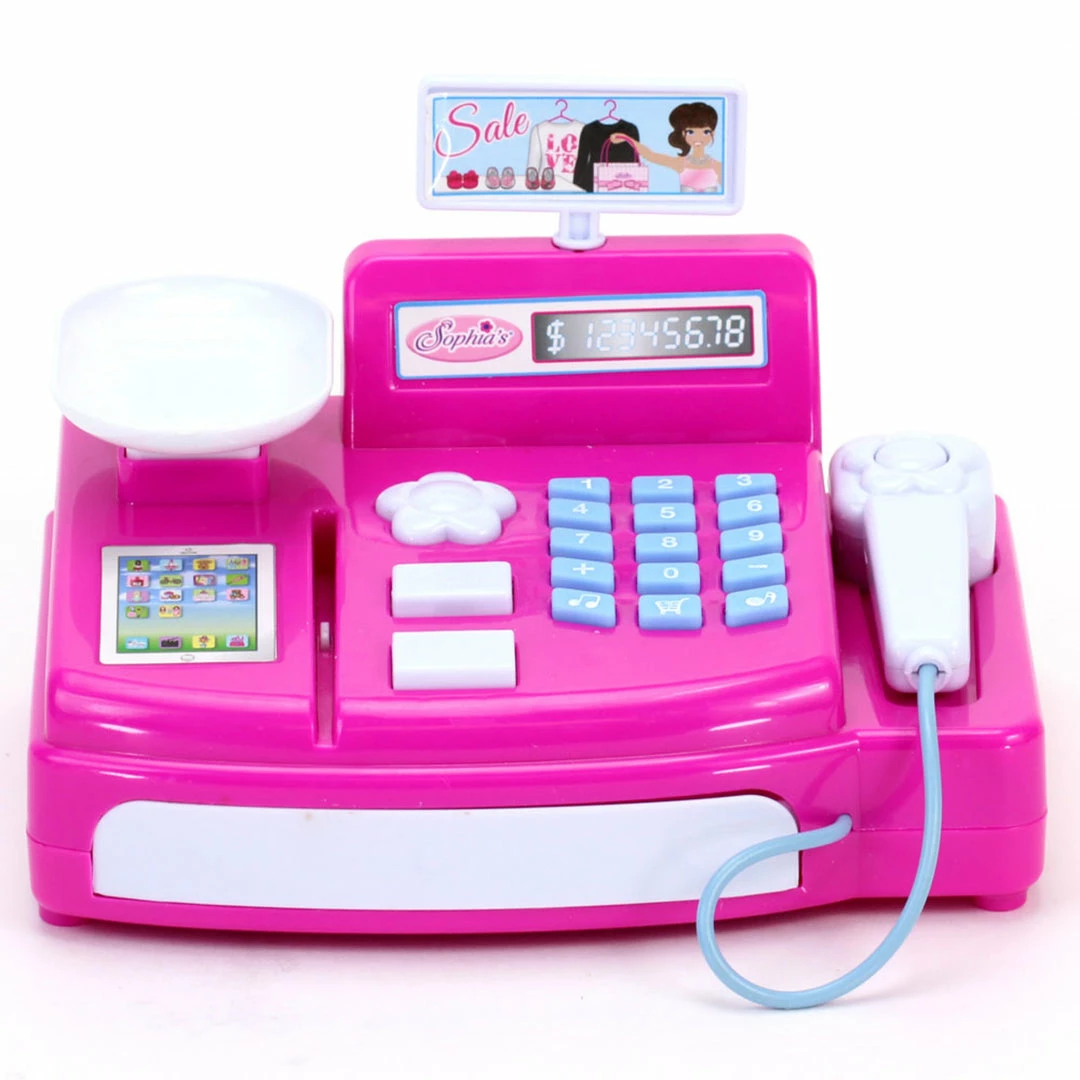 - INTERACTIVE: The cash register features a scanner with light, buttons with sound effects and music, a scale, credit card swiper and an open/close cash drawer.