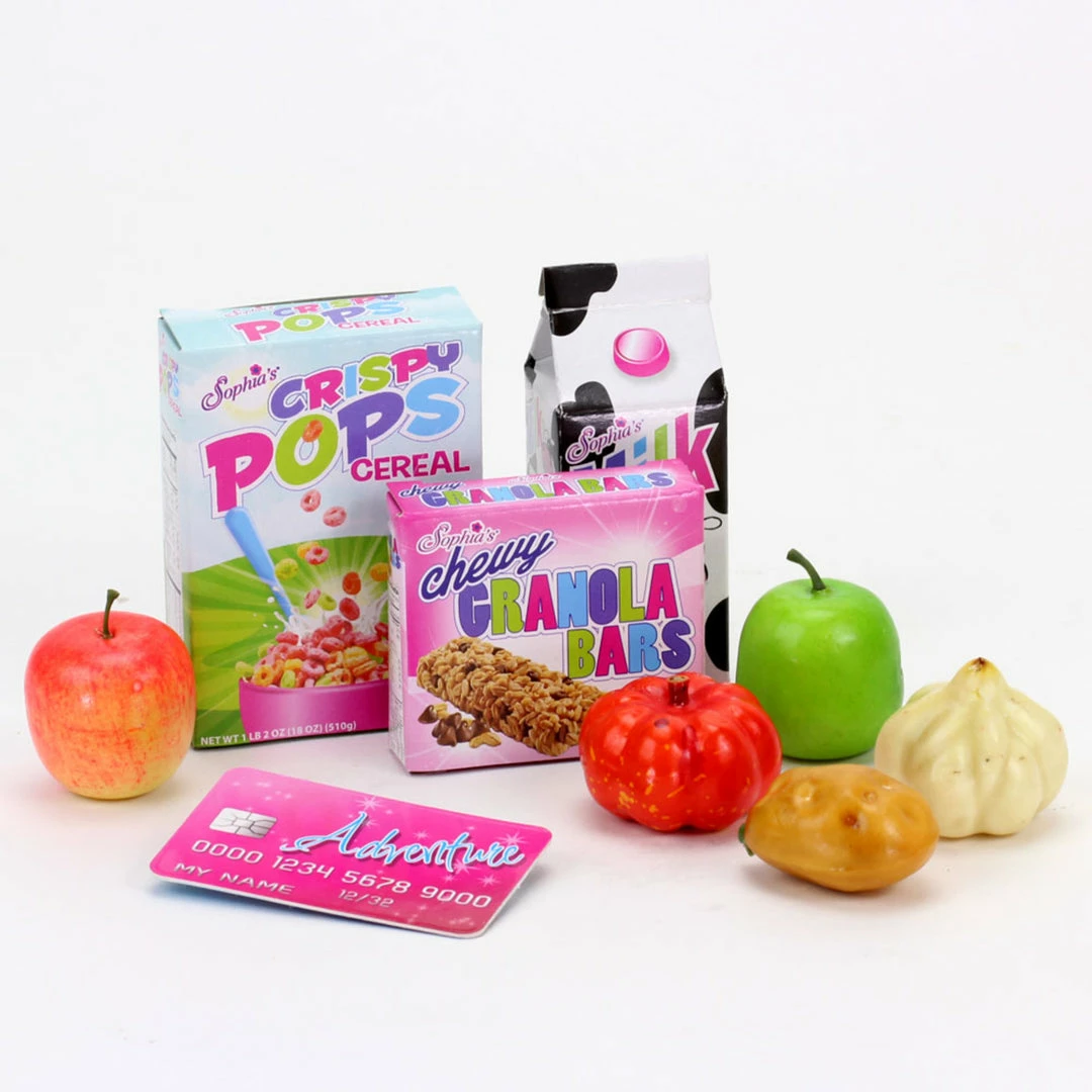 - PRETEND FOOD: Detailed fruits and veggies include a potato, red apple, garlic, granny smith apple and red kuri squash. A box of cereal, granola bars and carton of milk complete dolly’s list of groceries.