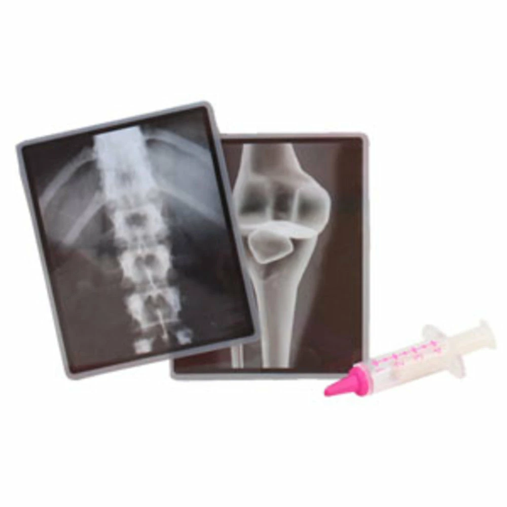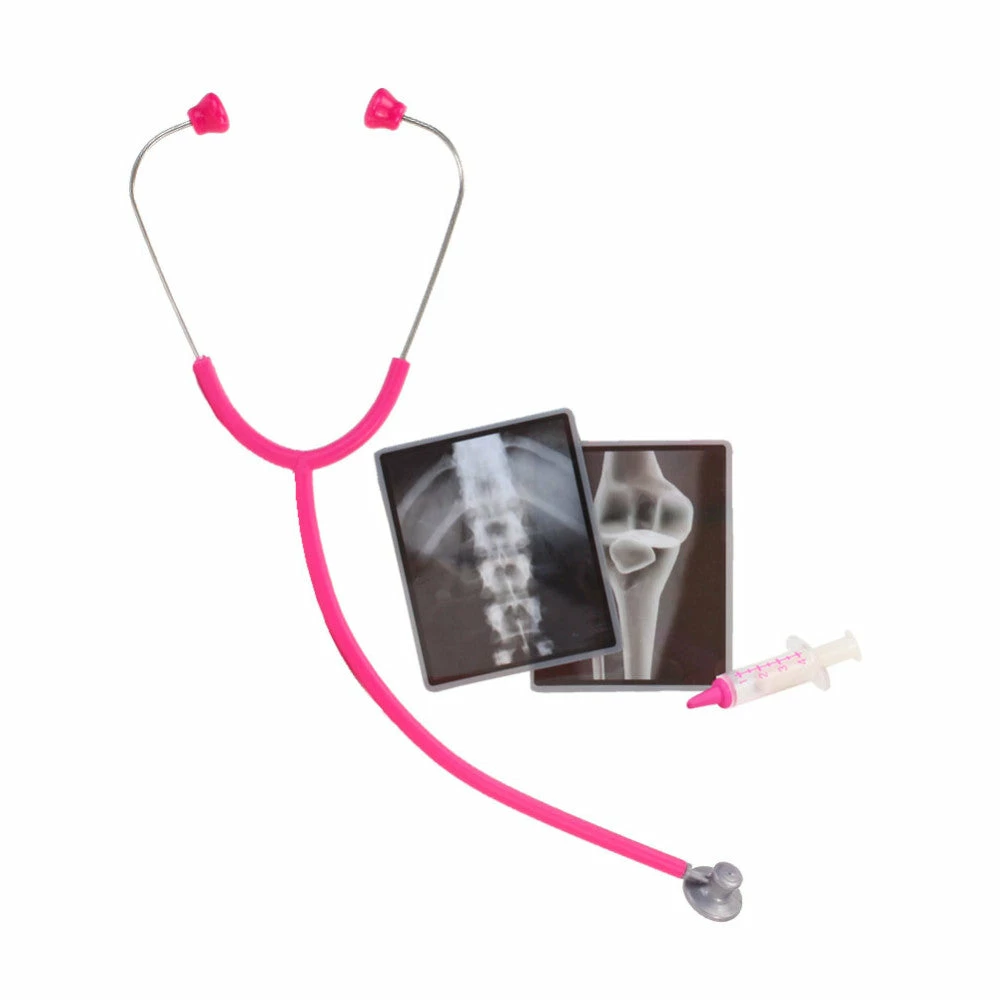 - DETAILED: This unique, detailed set features realistic x-rays of the spine and knee, a rubber stethoscope, plastic pen, functioning syringe, and open/close clip on the clipboard. The medical intake form can really be filled out with the “patients” name, blood type, temperature and more.