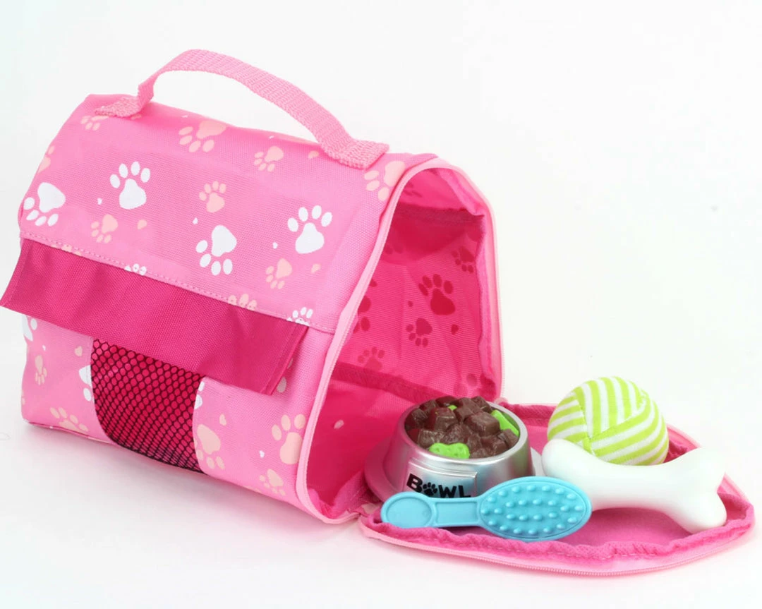 - DOLL PLUSH PUPPY DOG SET: Includes a 6 1/2″ plush puppy dog, collar, leash, food bowl, brush, toy ball, toy bone, puppy bed, blanket, and carrier all packaged into a cute decorative box
