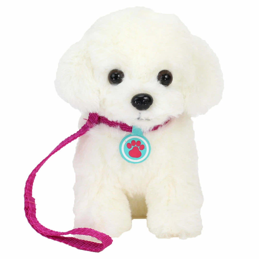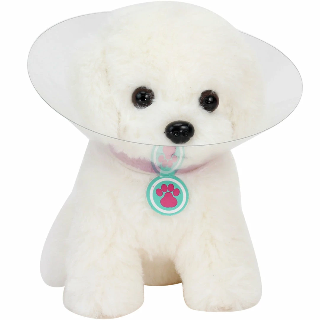 - INCLUDED: 13 piece set includes a white 6.5″ tall plush puppy, collar, leash, plastic cone, medical bag, stethoscope, otoscope, thermometer, bandage, clipboard, pencil, medical checklist, and adoption certificate plus features light and sound effects for hours of pretend play!