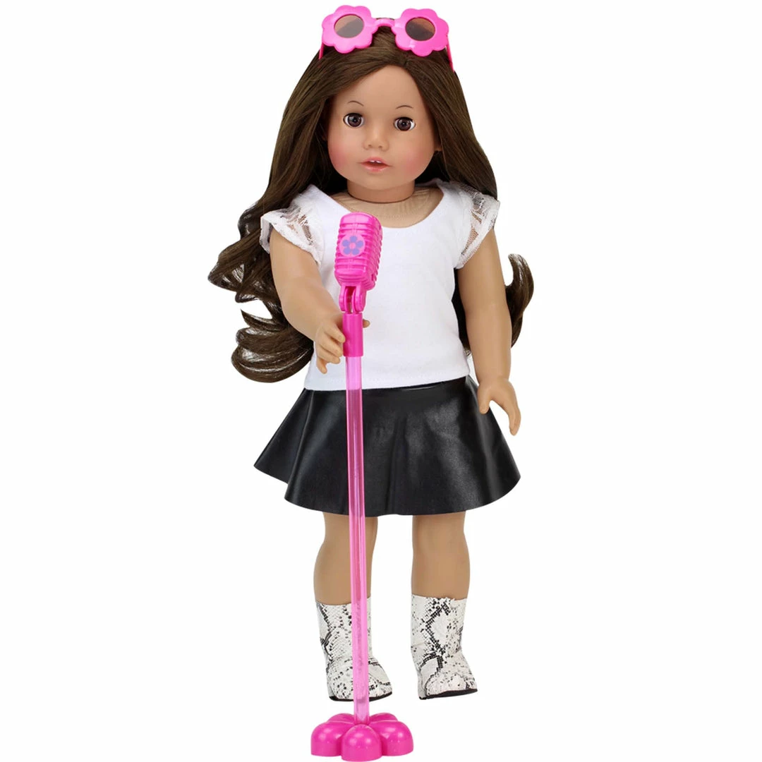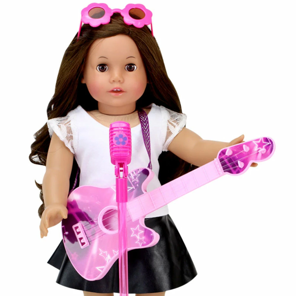 Whether your little one’s doll is a singer-songwriter, or rock ‘n roller, they’ll enjoy this music set sized for 18 inch dolls. Set includes a pink plastic guitar, free standing microphone, flower sunglasses and sticker sheet so your little one can personalize their doll’s guitar! Doll not included.