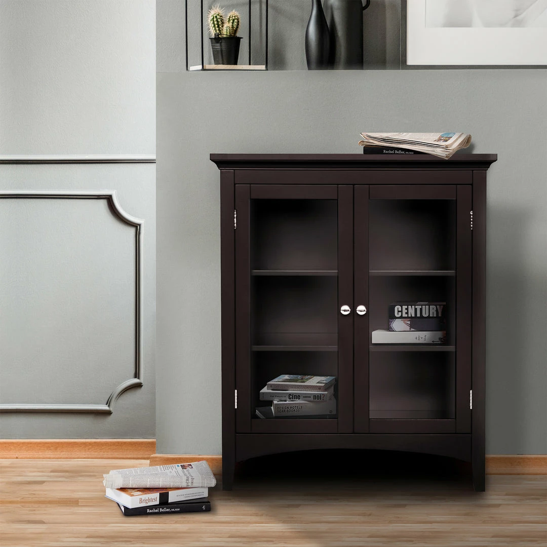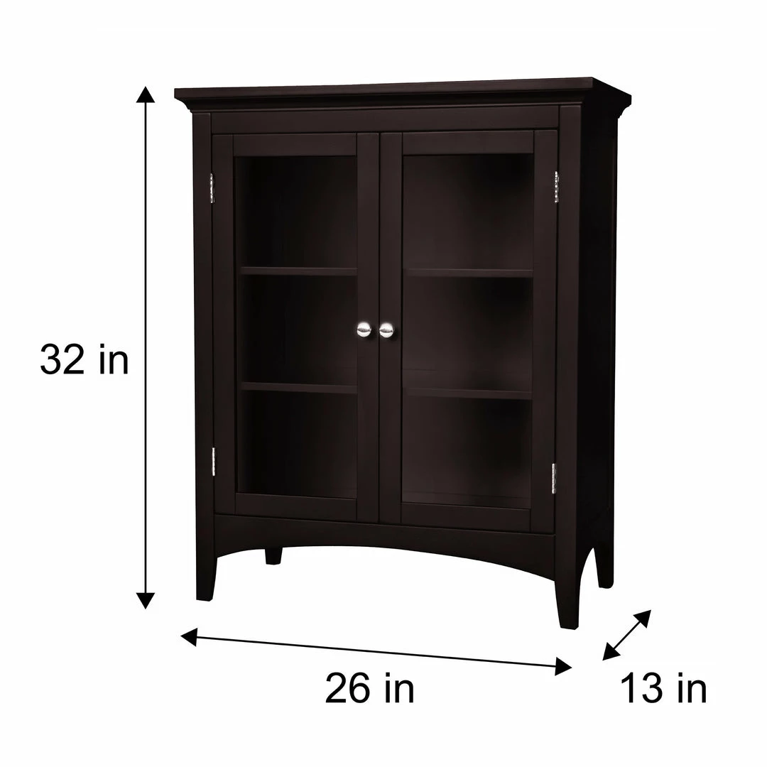 - STYLISH FLOOR CABINET: Features an espresso finish with arched bottom skirting, 2 glass doors, and chrome knobs for a beautiful addition to your space