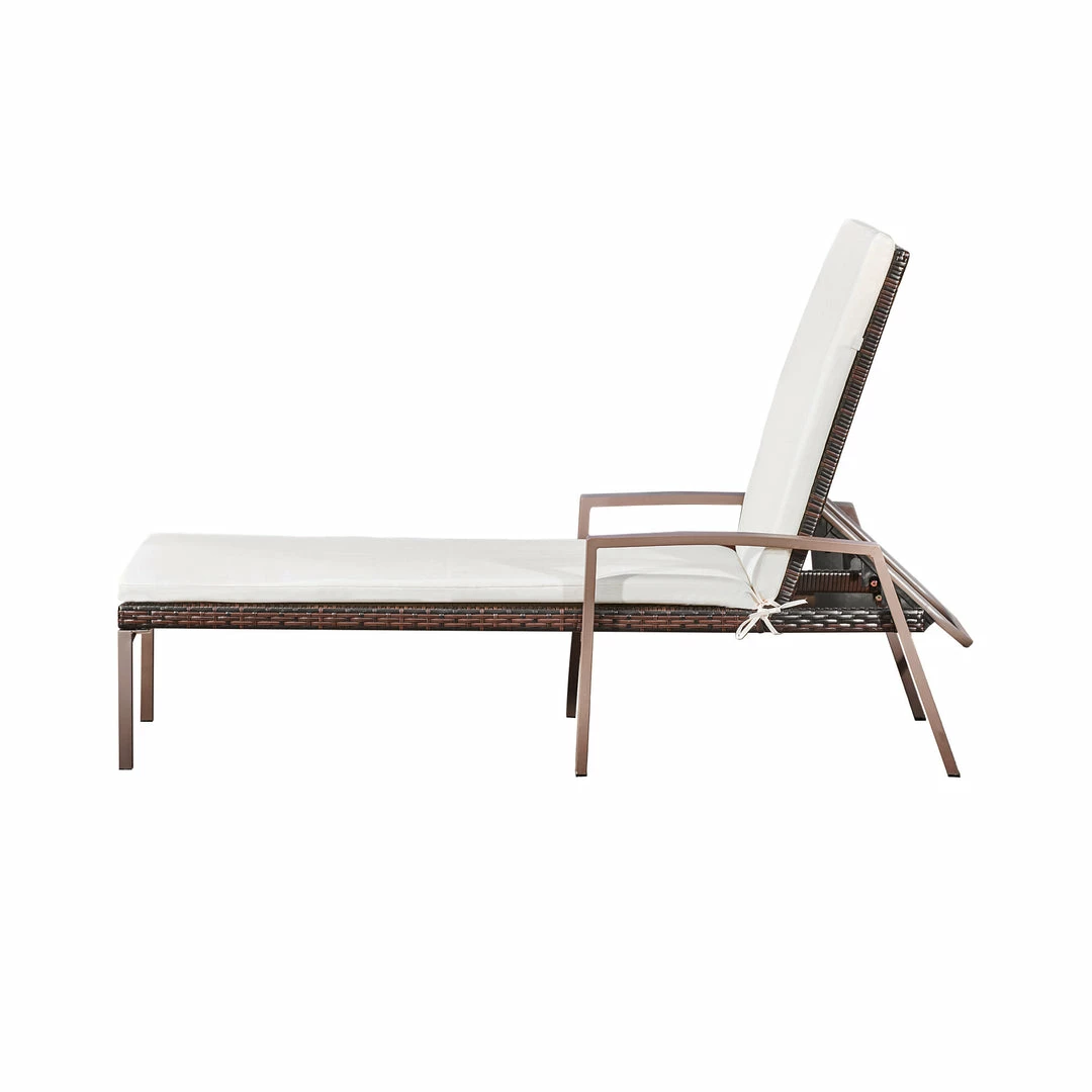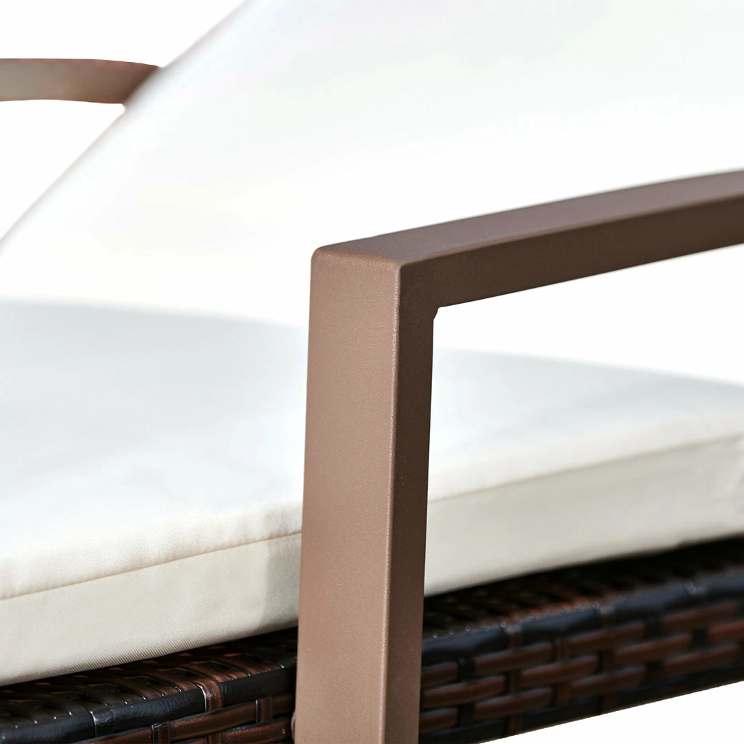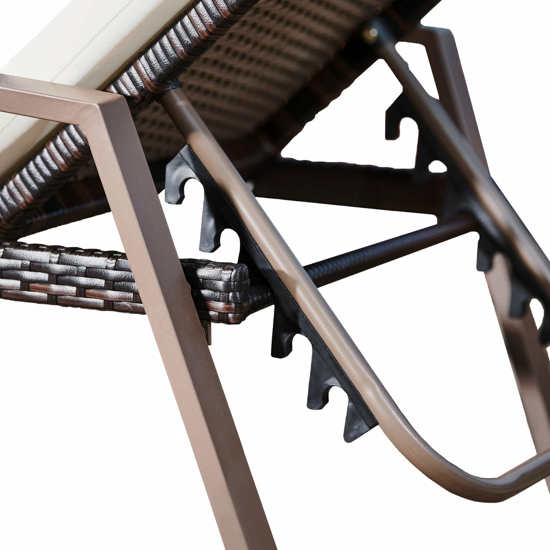 - INCLUDED: Two woven rattan lounge chairs with steel frames, adjustable reclining positions, armrests and cushions.