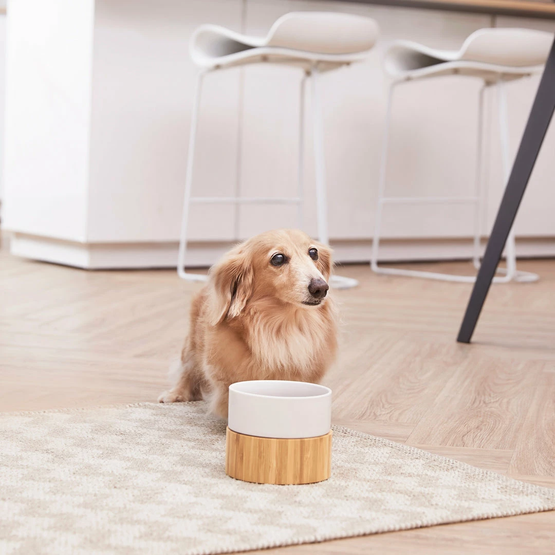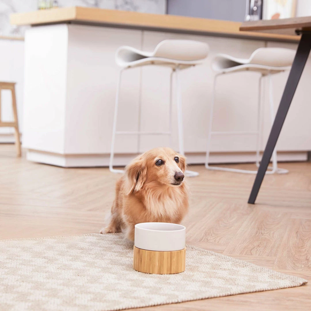 Keep your four-legged friend happy and healthy with this veterinarian recommended Billie Elevated Ceramic Pet Bowl by Teamson Pets! Billie’s raised bamboo base is not only stylish, but maintains pet posture, which removes strain on the neck and joints. Non-slip pads and a securely sitting white dishwasher safe ceramic bowl prevent food or water spillage, protecting your pet AND your floors. Sized for cats and small or toy breed dogs.