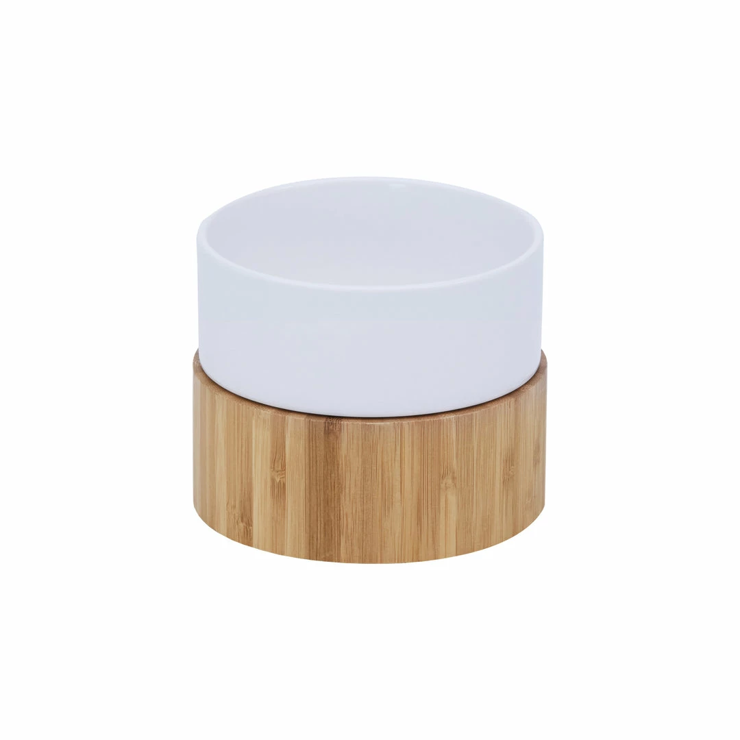 - INCLUDED: One bamboo wood platform feeder with a white ceramic food dish for cats or small dogs.