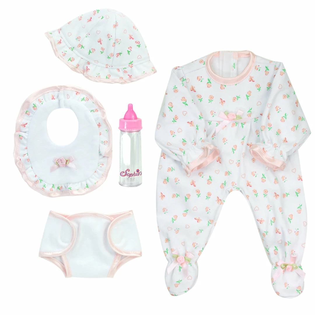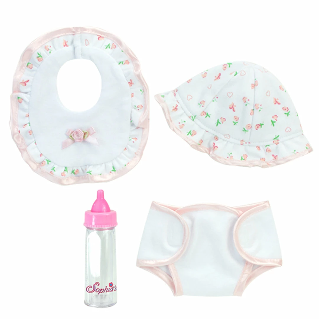 - DETAILED: This soft white cotton sleeper is covered in sweet flowers, and rose details. A matching baby hat and bib include gathered hems. A white cloth diaper is sure to be used over and over again, and all pieces feature a pink satin trim. To complete this set, a clear “milk” bottle with pink cap is also included. These details make this a complete, realistic set.