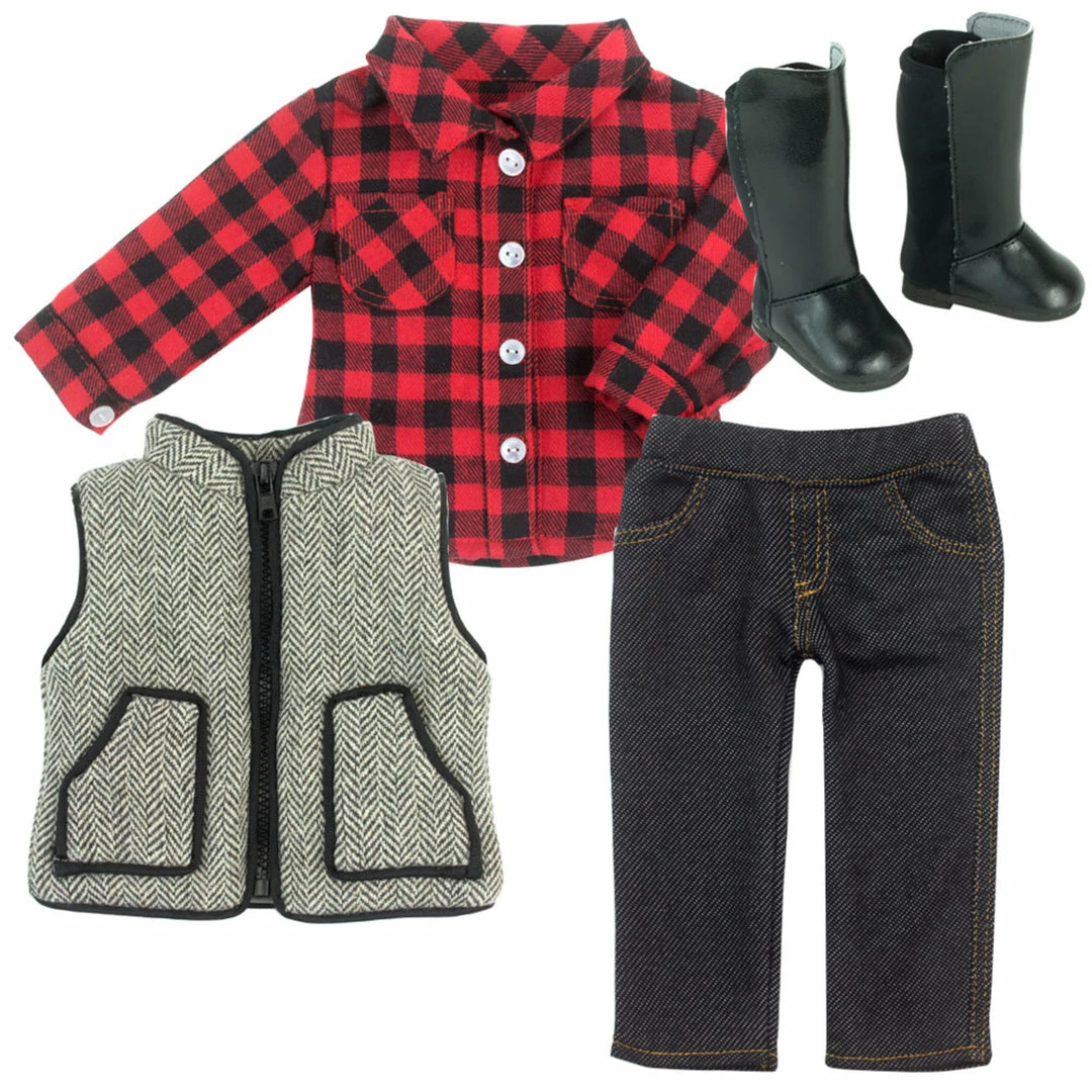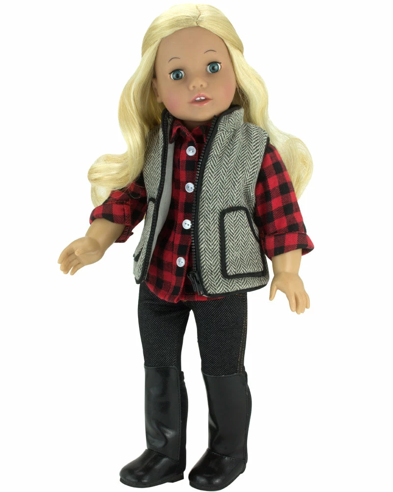 - DOLL CASUAL OUTFIT SET: Includes a red and black buffalo checkered shirt, black jeggings, herringbone print vest, and black over-the-knee boots for a colorful, stylish outfit