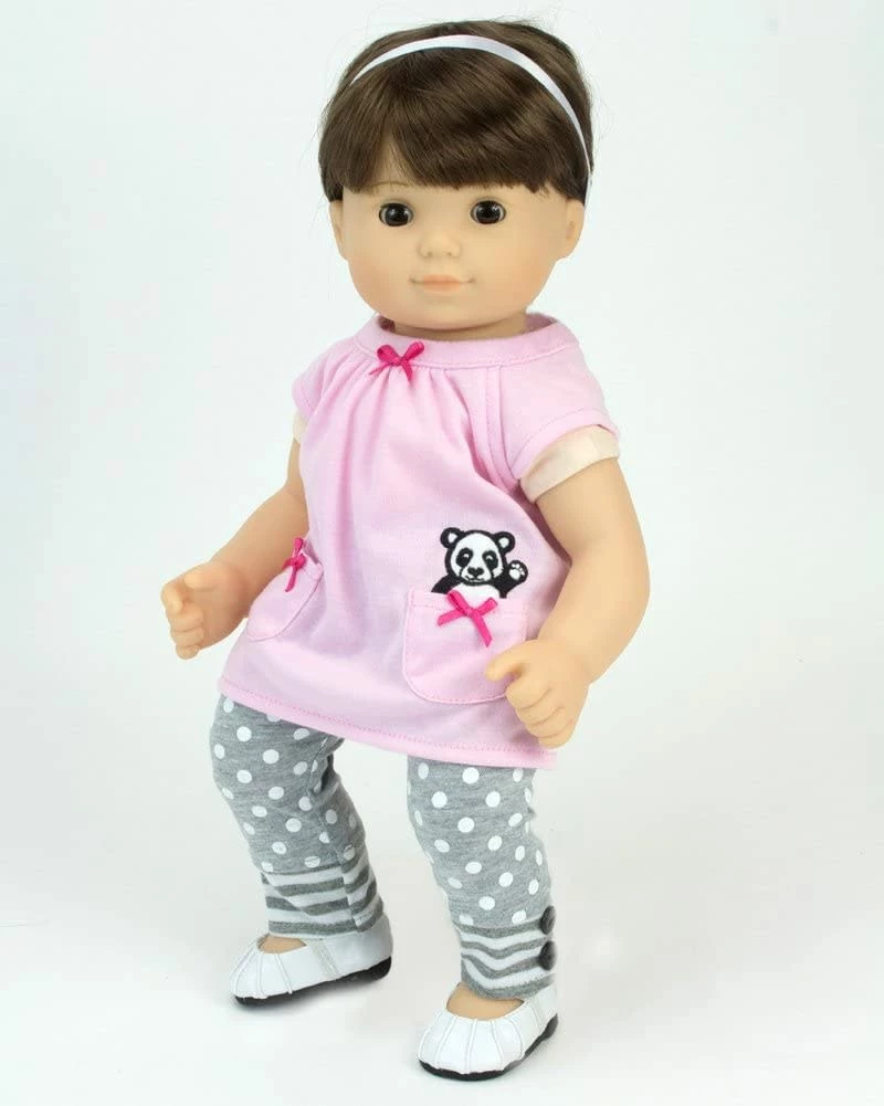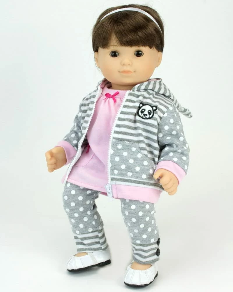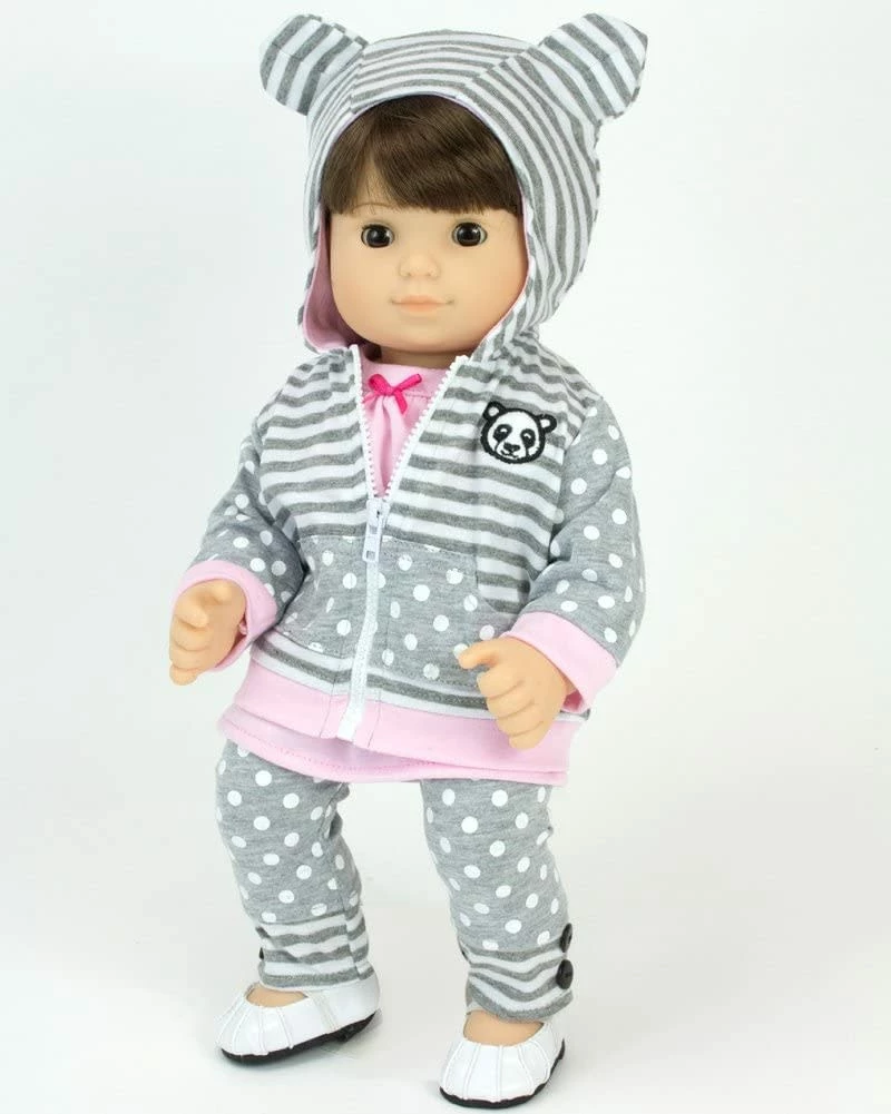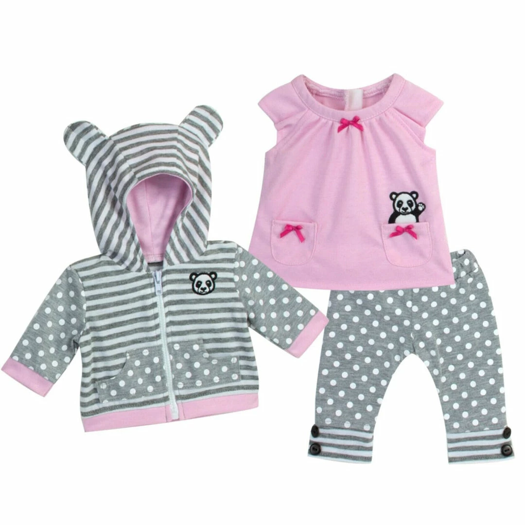 - DOLL CASUAL OUTFIT SET: Includes a panda bear gray striped zip up hooded sweatshirt, a pink tunic embroidered with a panda bear, and gray polka dot leggings with striped trim and buttons