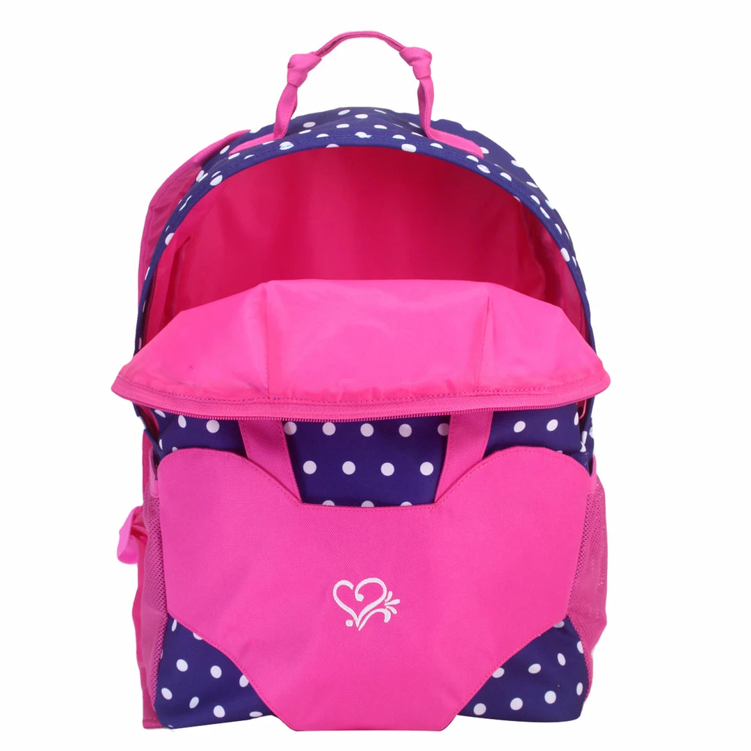- DETAILED: This navy nylon backpack is speckled with white polka dots and is large enough to hold school supplies, books, clothing and more. A doll carrier is attached to the front so your little one never has to go without their favorite doll or plush friend. Hot pink side mesh pockets can store your water bottle or quick access items, like doll brushes. The padded should straps and knotted handle add a splash of hot pink making this a beautifully polished backpack.