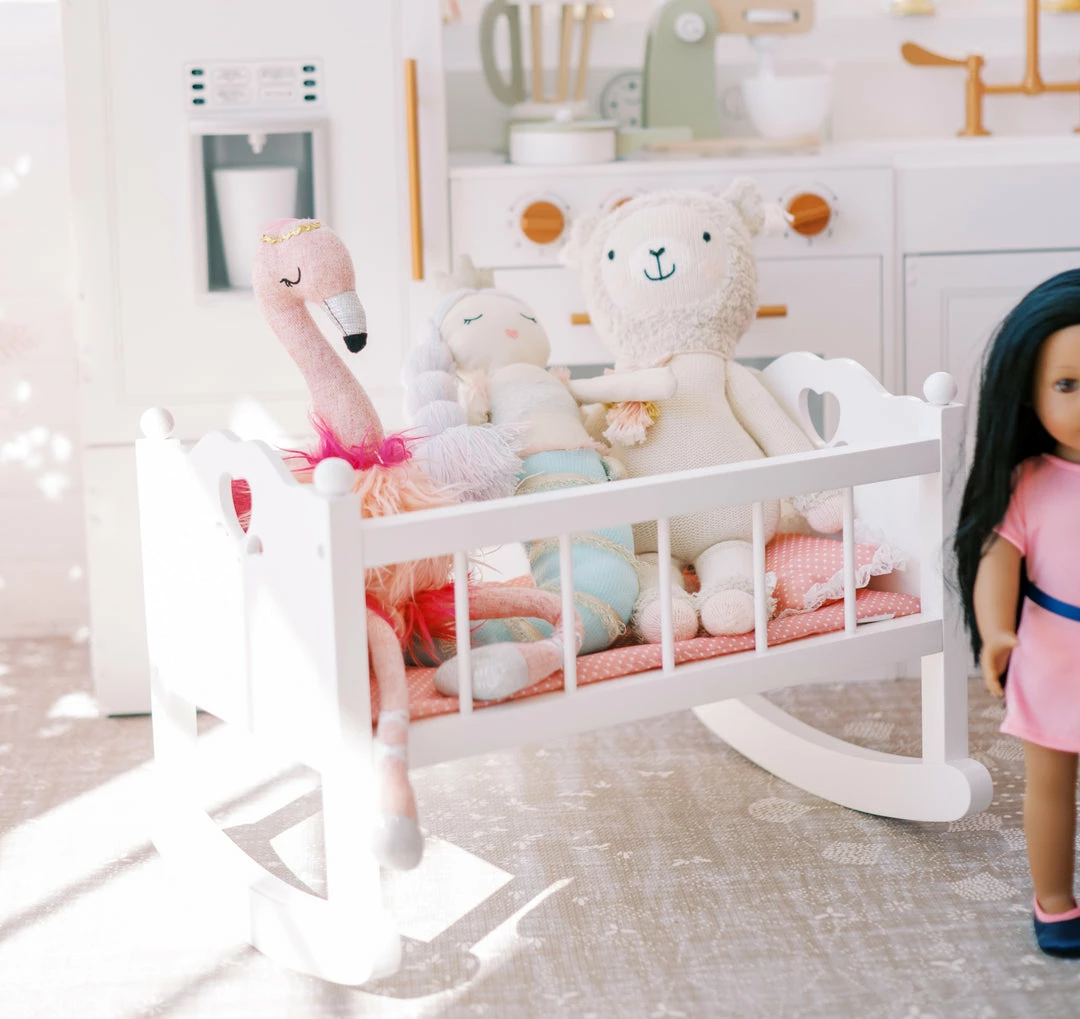 Give your little one a stylish piece of furniture to keep their dolls comfortable with the Sophia’s by Teamson Kids High End Baby Cradle. This detailed cradle features a classic white design with slatted sides, heart cutouts, pink polka dot bedding and pillow to complete their doll living space. The interactive rocking design allows your little one to lull their baby doll to sleep for more engaging play. Made for 15″ dolls, the set is compatible with Bitty Baby, Madame Alexander, Corolle, and more! The cradle measures approximately 21″ x 14″ x 15″ when assembled. Dolls not included.