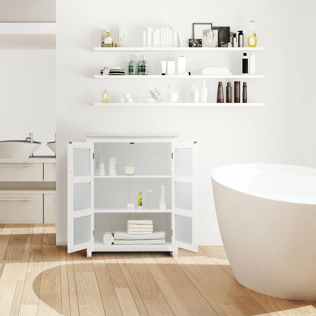 - FUNCTIONAL: This floor cabinet has double doors with two inner shelves, one fixed and one adjustable. Allowing a lot of extra storage room for soaps, shampoos, towels, toiletries, and more but taking up little to no bathroom space.