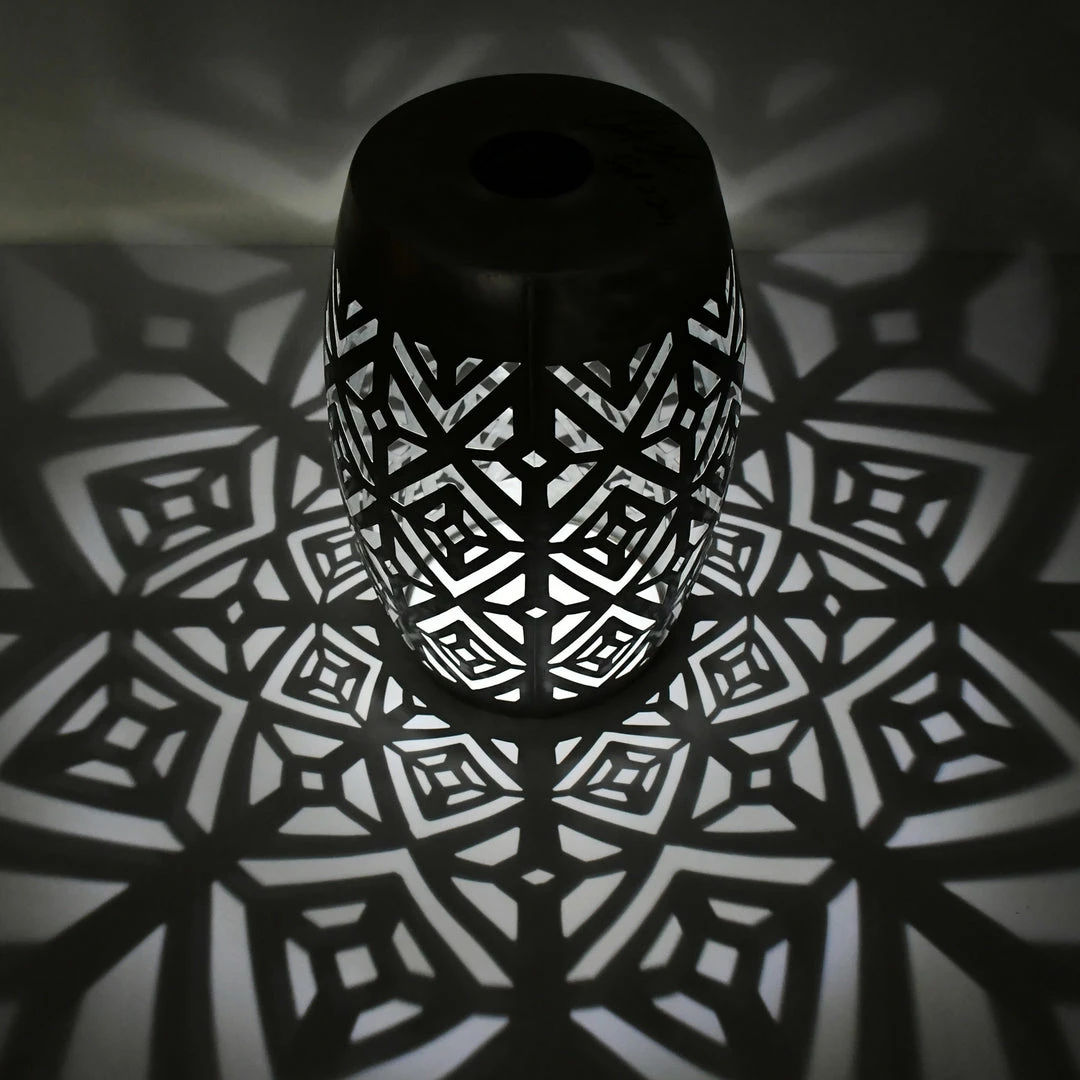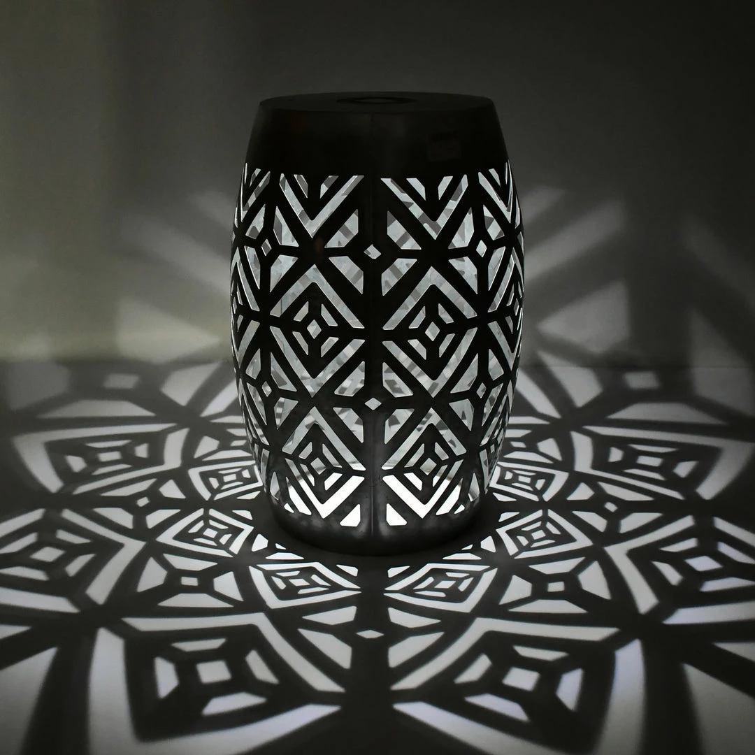 - SOLAR POWERED: This beautiful cut out side table has a solar powered light installed in the center of the tabletop for patio lighting and casts a decorative shadow at night.