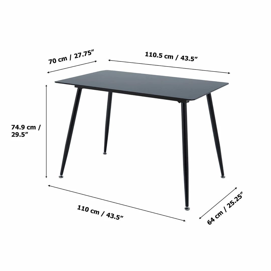 - DIMENSIONS: This Glass Dining Table is 43” long, 27″ deep, and 29” tall.
