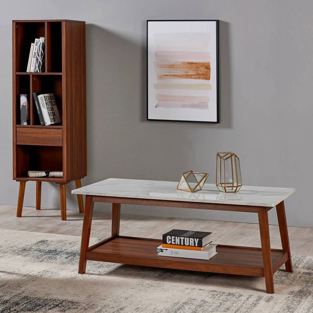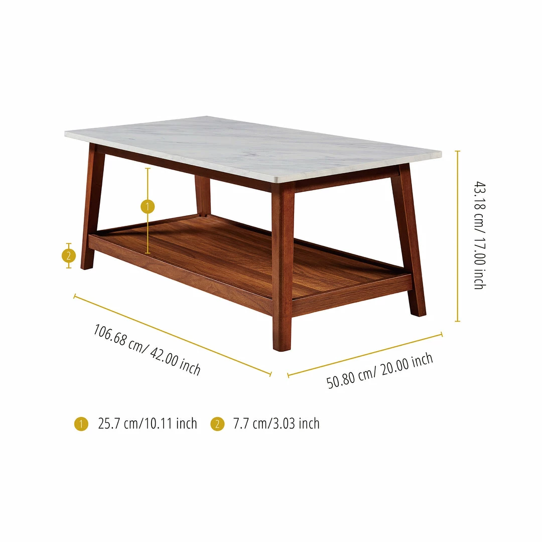 Teamson Home Kingston Wooden Coffee Table with Storage and Marble-Look Top, Marble/Walnut