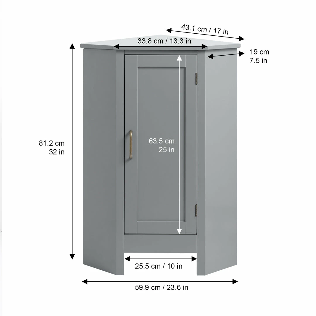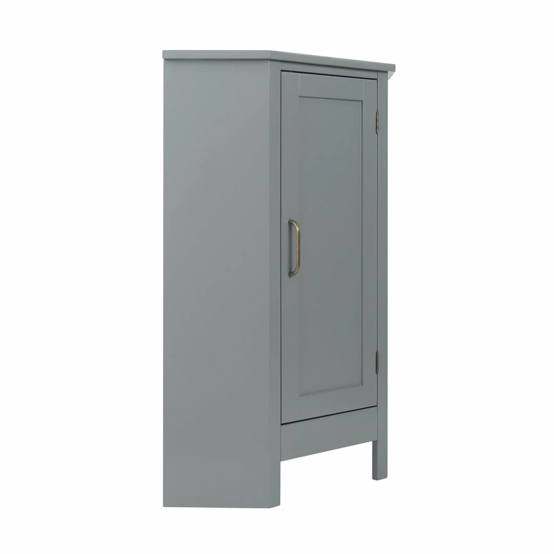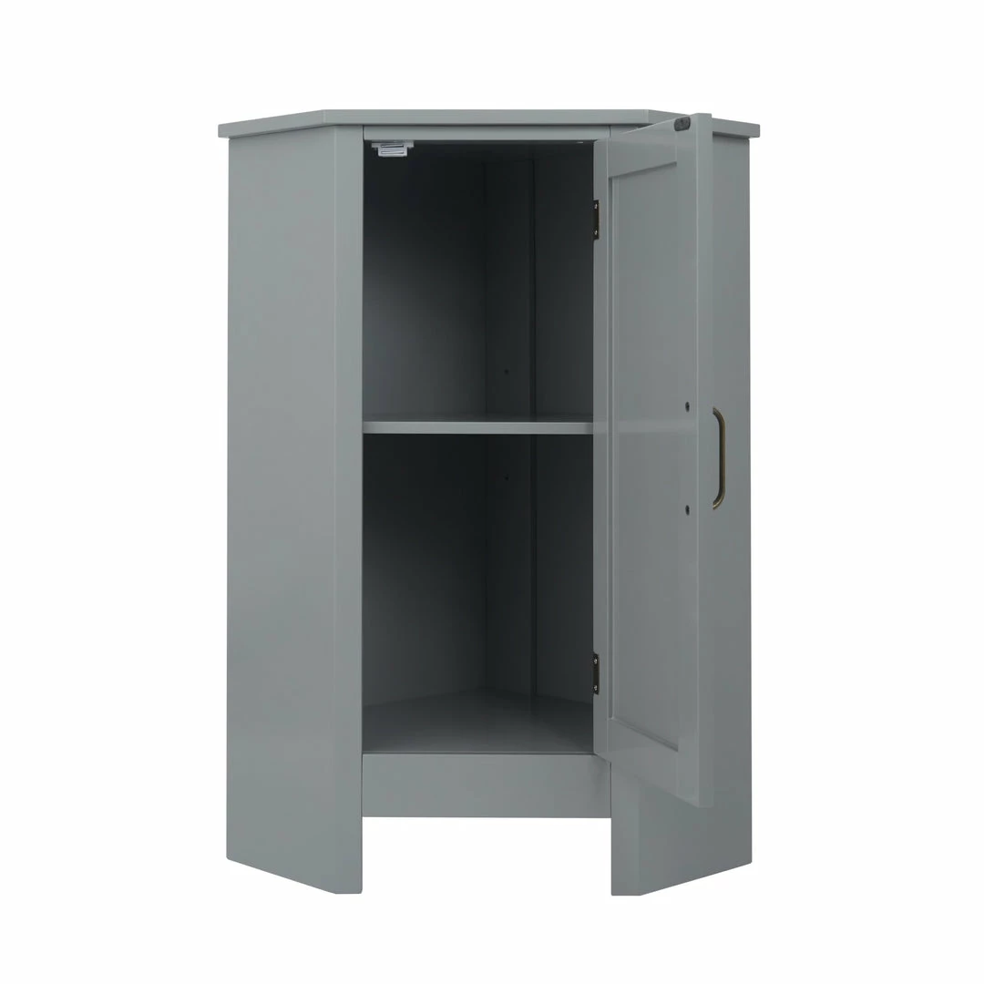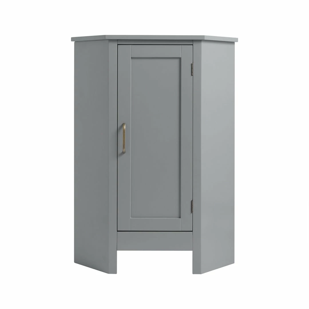 - STYLISH CORNER FLOOR CABINET: Features a sleek gray finish with brass pull hardware for an elevated and stylish addition to your space, and the wedge shape fits perfectly in corners and narrow spaces
