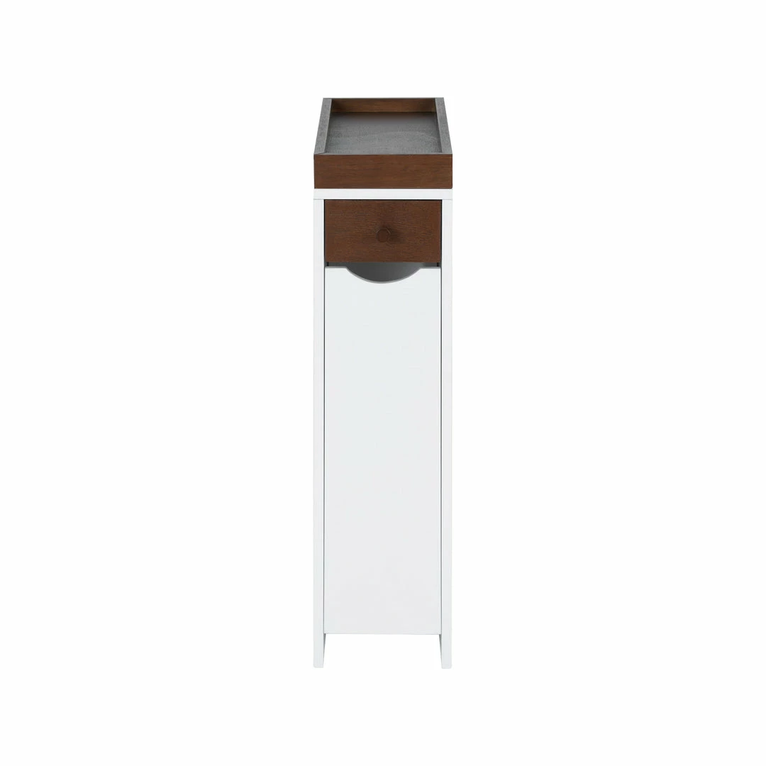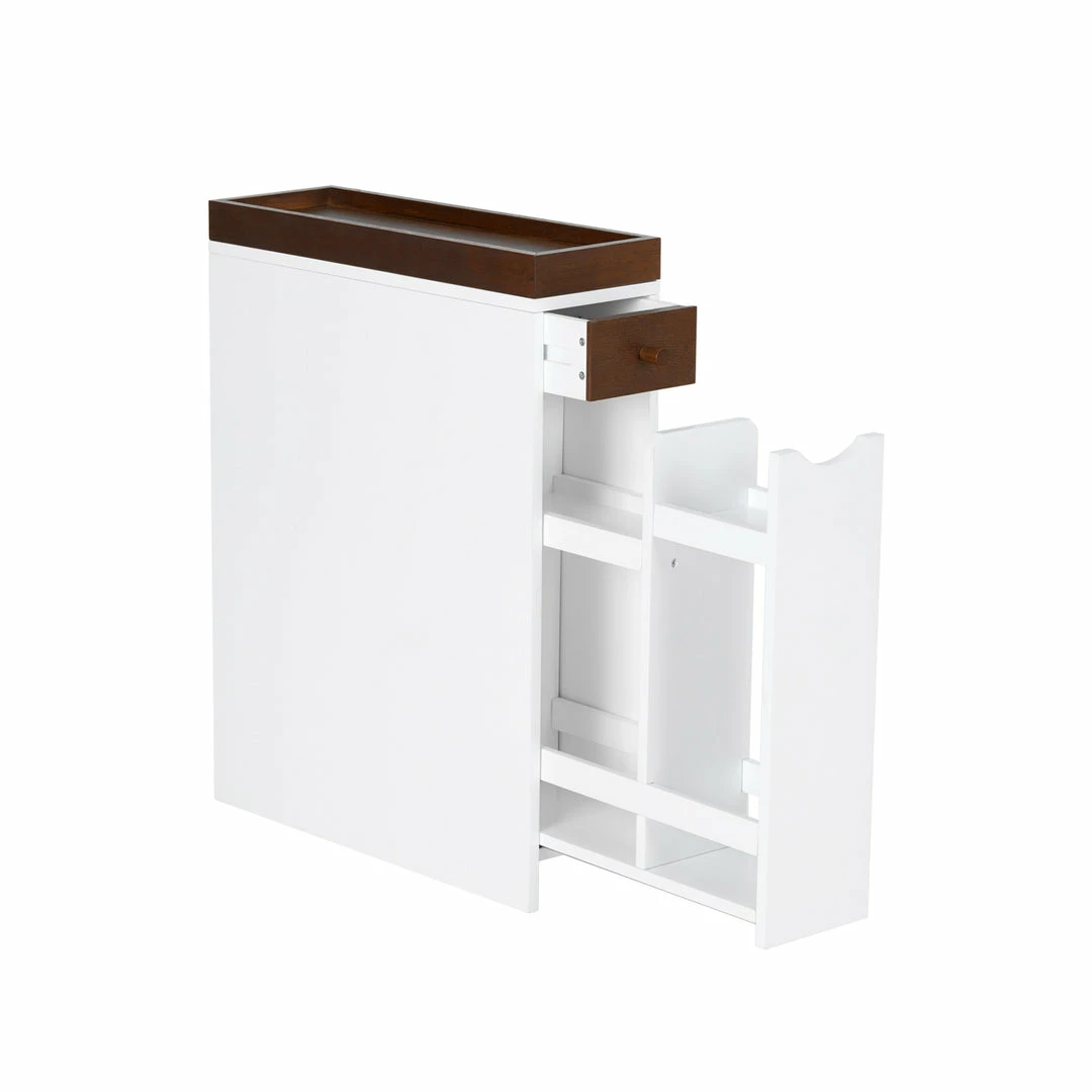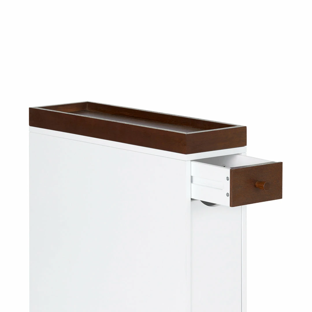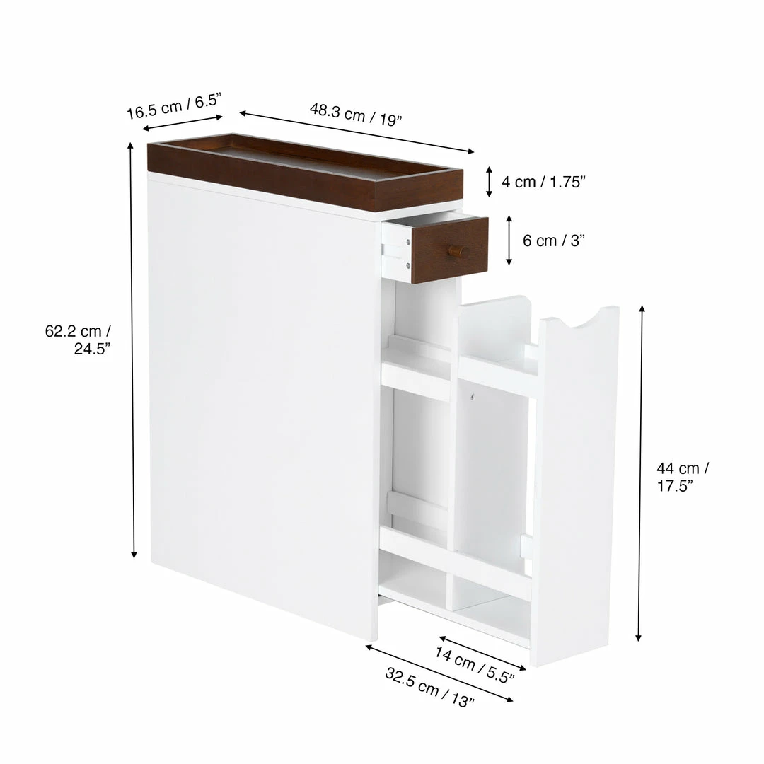 Solve your storage needs with the Teamson Home Narrow Cabinet with Storage Drawers. This two-tone farmhouse style cabinet is the perfect solution to tight spaces in the bathroom, bedroom, kitchen, or office. Hidden storage in the slide out drawer includes multiple compartments for keeping cleaning supplies, toiletries or kitchen utensils. A small top drawer can be used to organize items that require quick access. This multipurpose white cabinet features a removable wooden tray which can be used next to the bathtub to hold your book and candles, or in the kitchen as a snack tray. Freestanding cabinet measures 6.5″ long, 19″ deep, and 24.5″ tall to fit just about anywhere – between the sink and toilet, underneath a countertop and more!