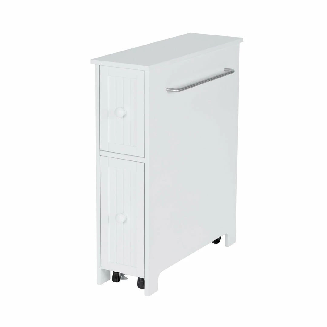 - INCLUDED: One white cabinet with a top drawer, larger bottom drawer, towel bar, and easy glide casters.