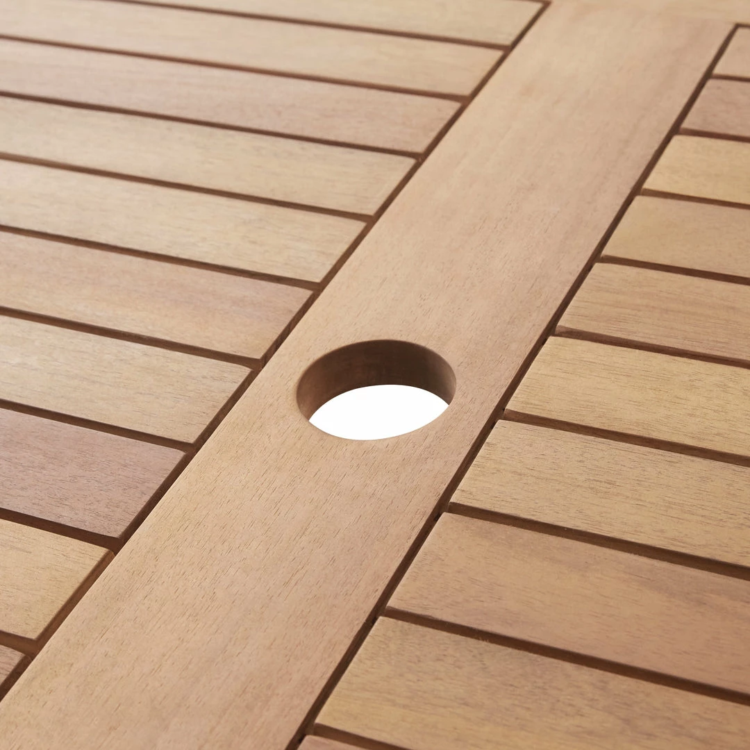 - SLATTED WOOD TABLETOP: Wood slat tabletop prevent water accumulation, and the integrated hole fits most standard-sized patio umbrellas so you can customize your level of shade (umbrella not included)