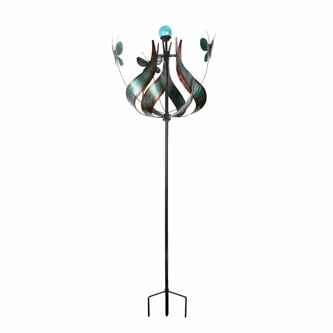 Teamson Home Outdoor Solar Tulip and Butterfly Kinetic Windmill Sculpture with LED Light, Teal