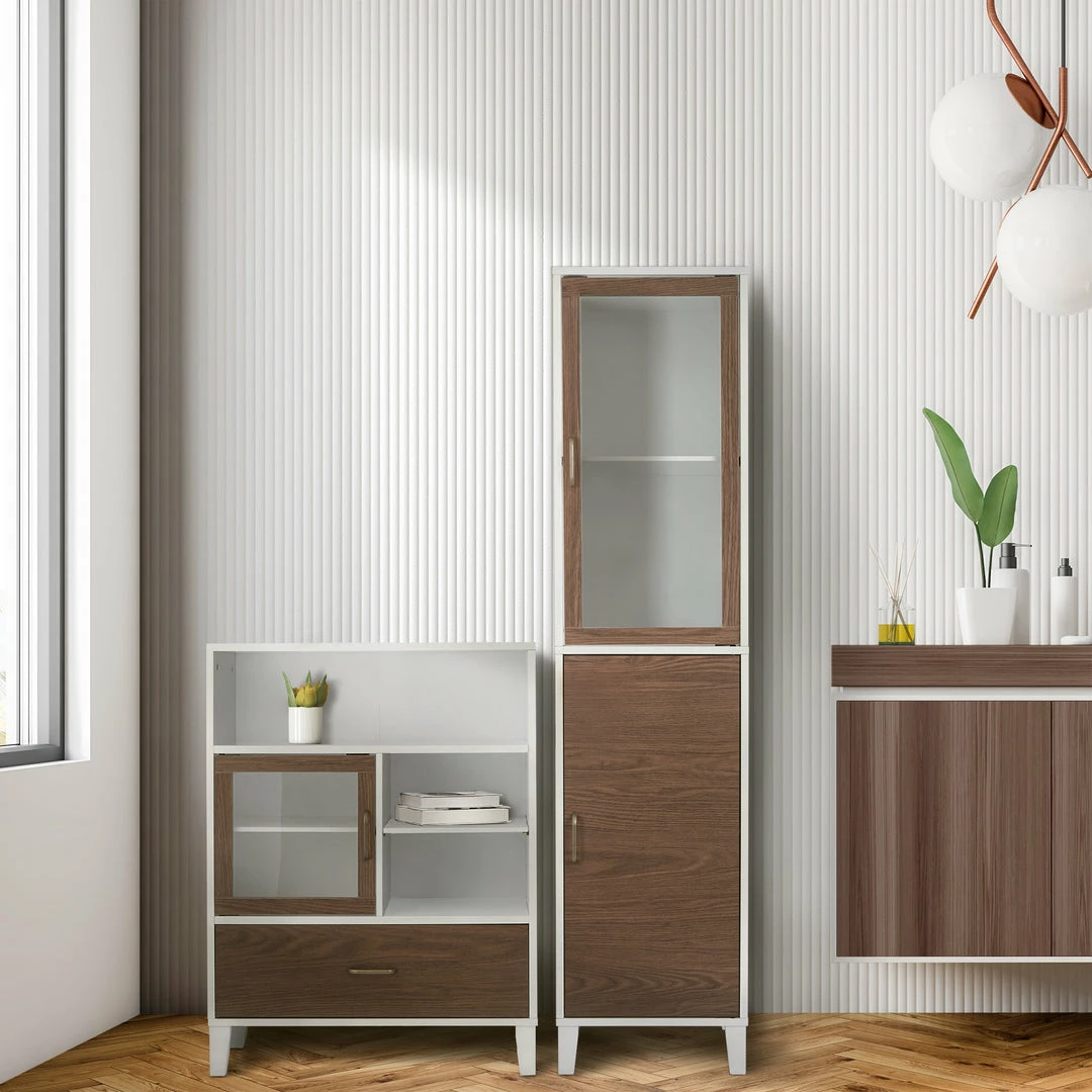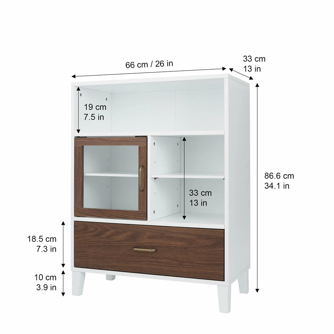 - STYLISH FLOOR CABINET: Features a sleek white finish with one glass-panel door and one contrasting walnut brown finished drawer with brass pulls for an elevated and stylish addition to your space