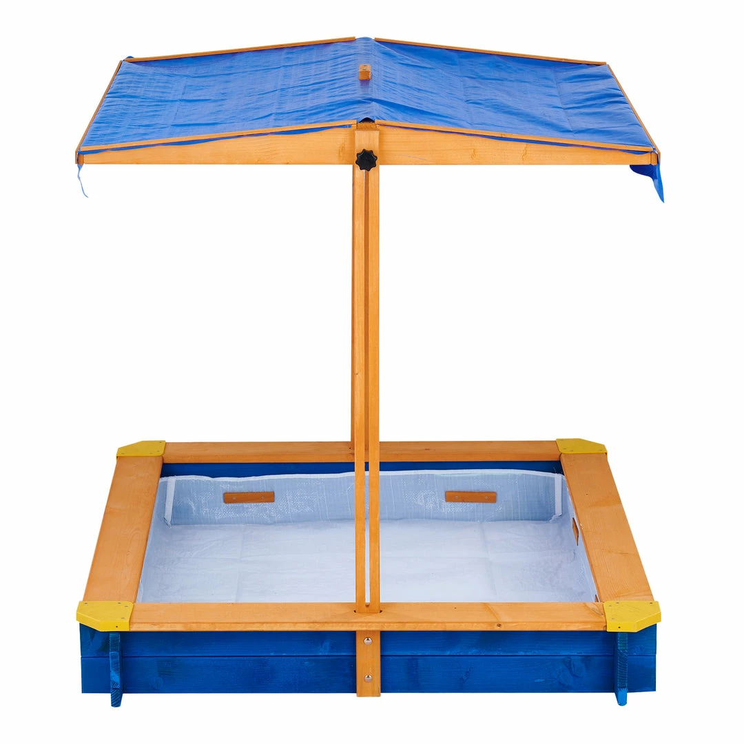 - BOLD COLORS: This solid wood sandbox features a stained natural wood finish in an amber color and a blue painted base and matching canopy tarp.