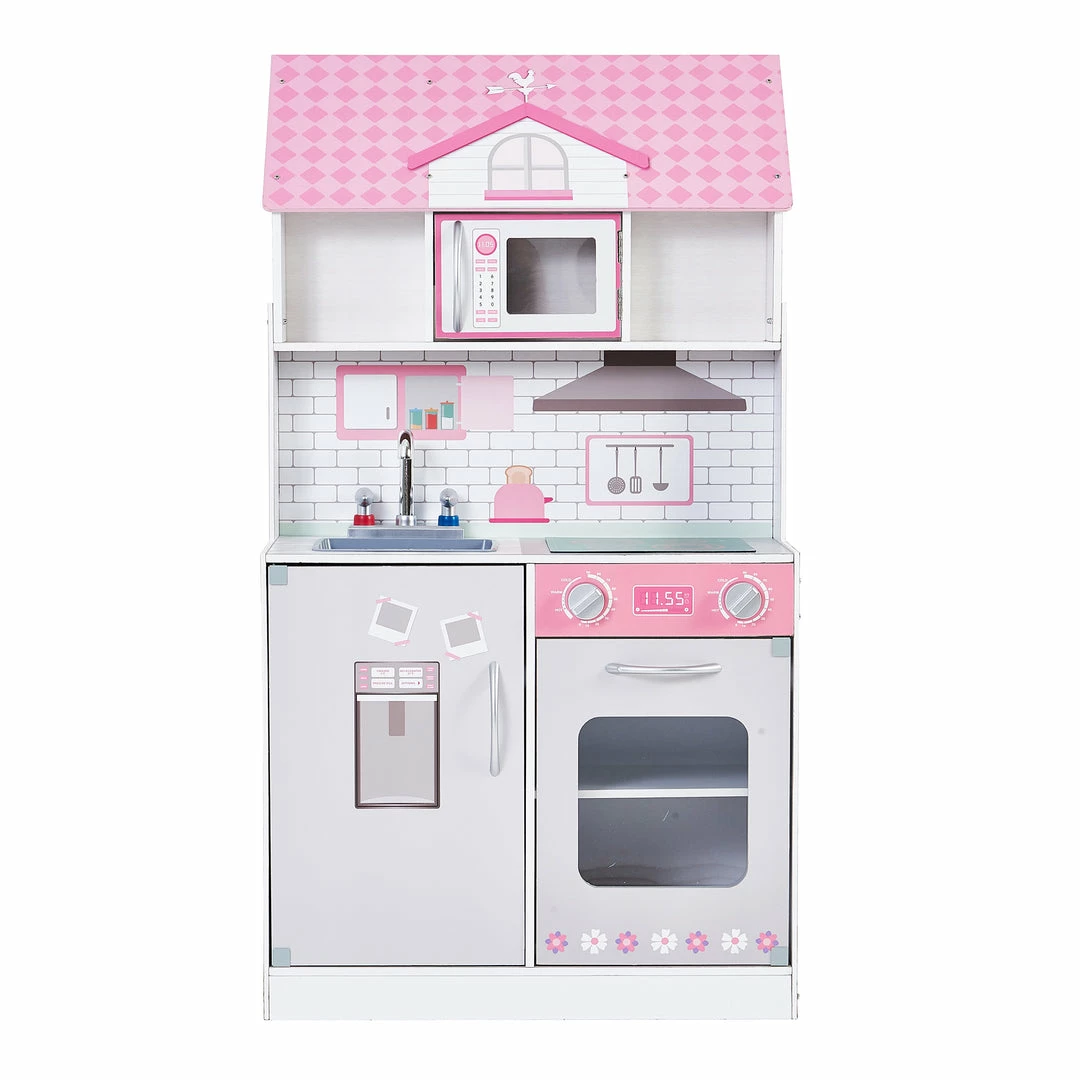 - KITCHEN SIDE: Kitchenette includes a microwave, sink, stovetop, oven and mini fridge and shelves. The chrome faucet with teardrop levers, clicking burner knobs, and subway tile backsplash add realistic details to this adorable kitchen set. The electric style cooktop provides a flat surface for preparing meals and a deep basin sink gives your little one a place to wash their dishes.