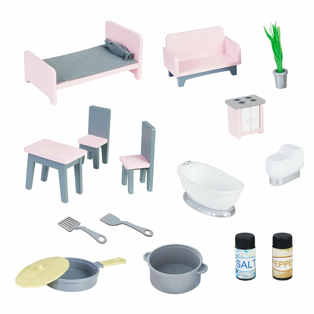- INCLUDED: One double-sided play kitchen/dollhouse with 16 accessories completes this 2-in-1 set. 7 cooking accessories include a pan with lid, pot, slatted spatula, flat spatula, and salt & pepper shakers. 9 pieces of dollhouse furniture include a bed, sofa, dinning table, two chairs, stove, plant, toilet with sound effects and bathtub.