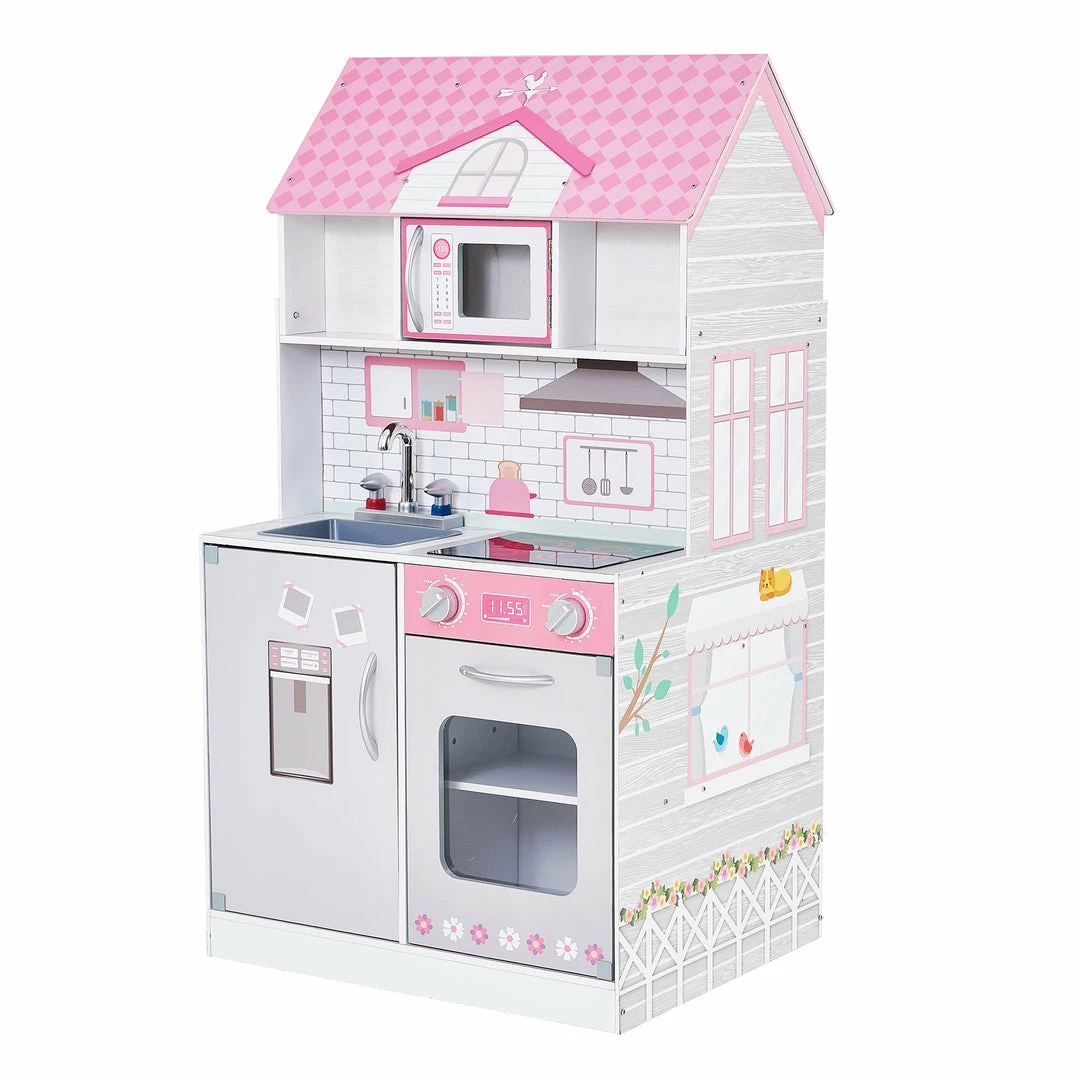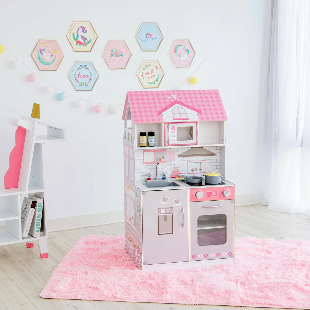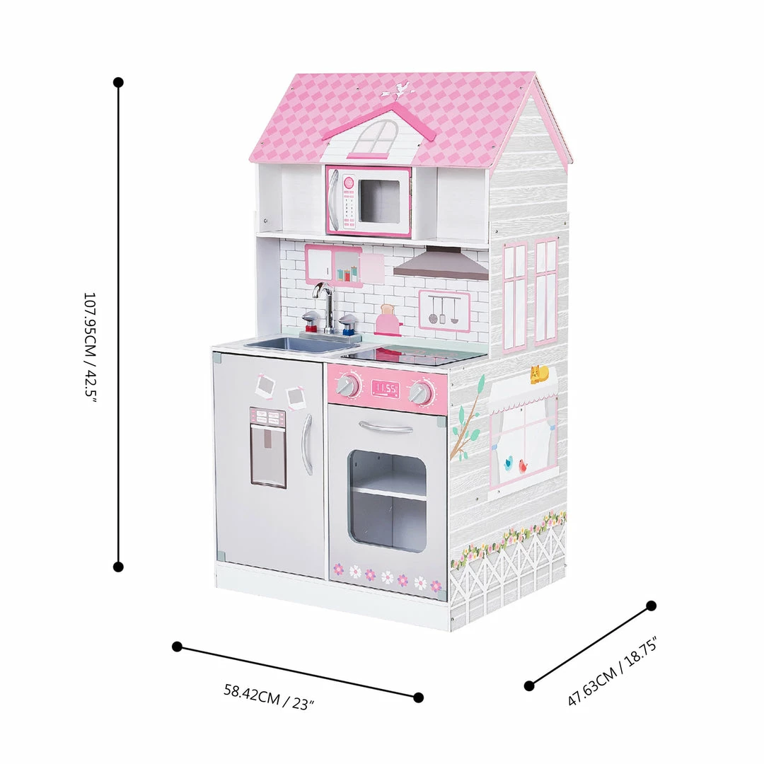 Every kid’s dream- a kitchen AND dollhouse in one! Add multi-functional enjoyment to your little one’s play area with the Teamson Kids Wonderland Ariel 2-in-1 Kids Play Kitchen and Dollhouse. This countryside play kitchen and dollhouse is designed with a muted gray style and pink accents making it perfect for any bedroom or play area with limited space. The functional and interactive kitchen design features a refrigerator, sink, stove with turning and clicking knobs, oven, microwave, and 6 cookware accessories for engaging play. The dollhouse on the other side features 3-levels with five rooms plus a balcony, and 9 pieces of doll furniture including a toilet with sound effects. This kid-sized 2-in-1 set measures 23.5″ long, 18.75″ deep, and 42.25 tall and is compatible with 12″ dolls. Three LR44 batteries included.
