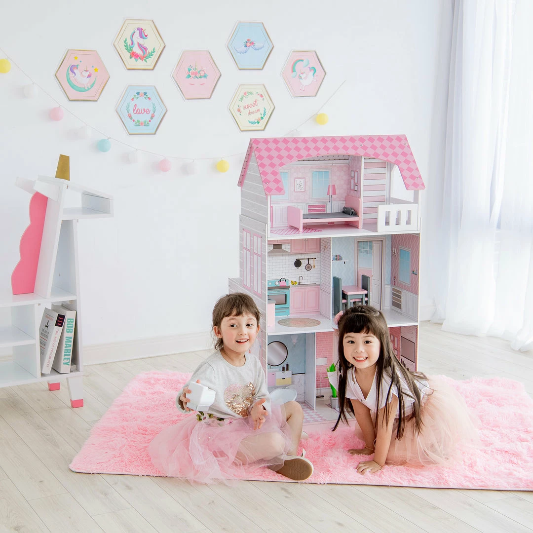 - DOLLHOUSE SIDE: This 3-story dollhouse is perfect for 12 inch dolls and features a bathroom, living room, kitchen, dinning room, bedroom and balcony. Beautiful illustrations inside and out including a white picket fence, checkered floor tiles, wainscoting and more add to this dollhouse’s charm.