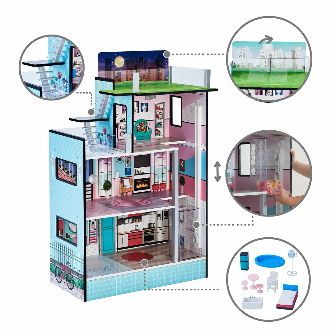 Teamson Kids Dreamland Barcelona Dollhouse with 10 Accessories, Turquoise/Black