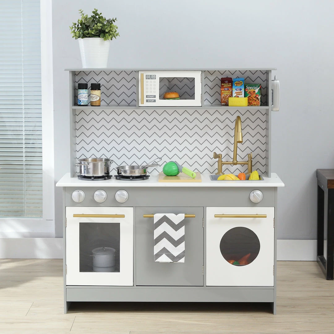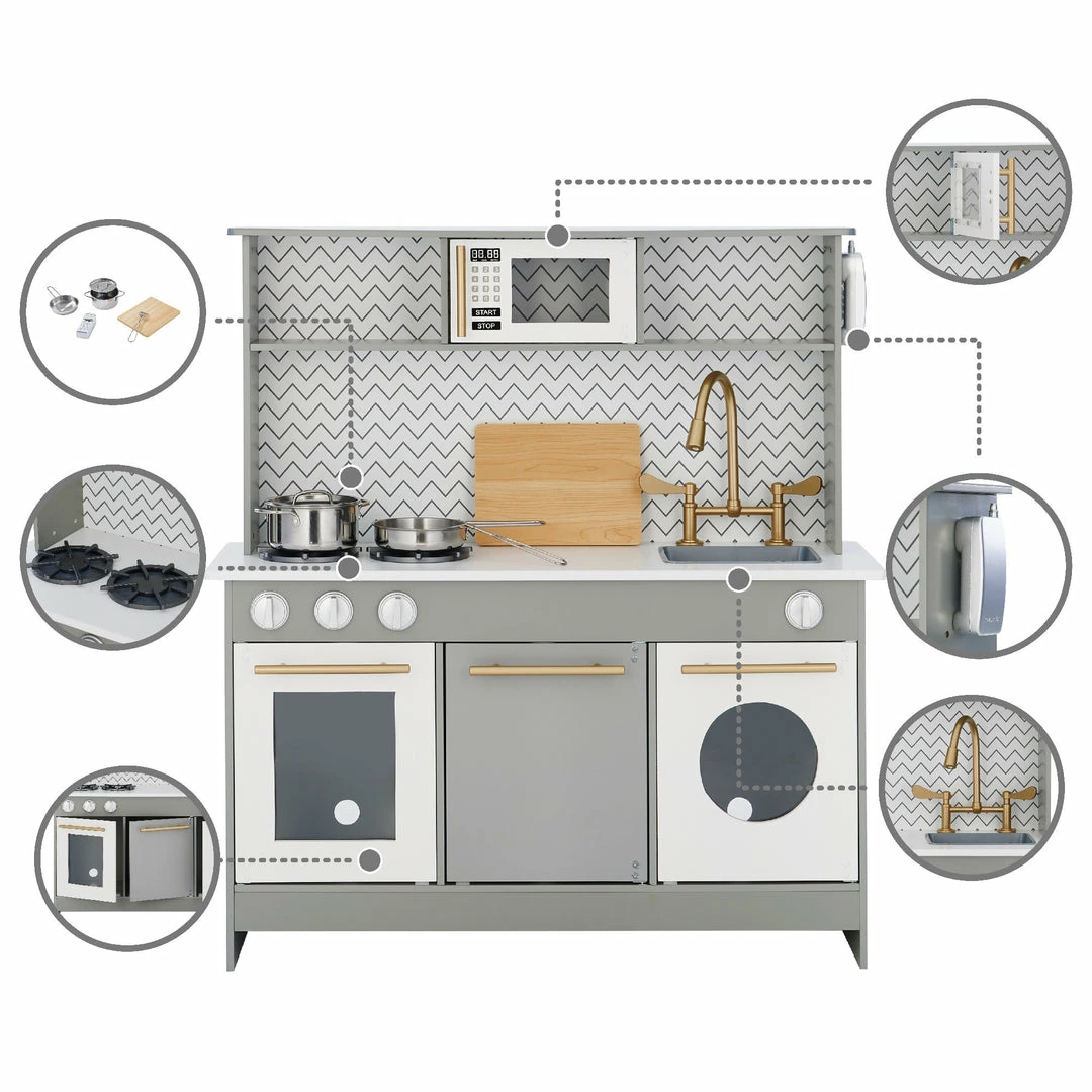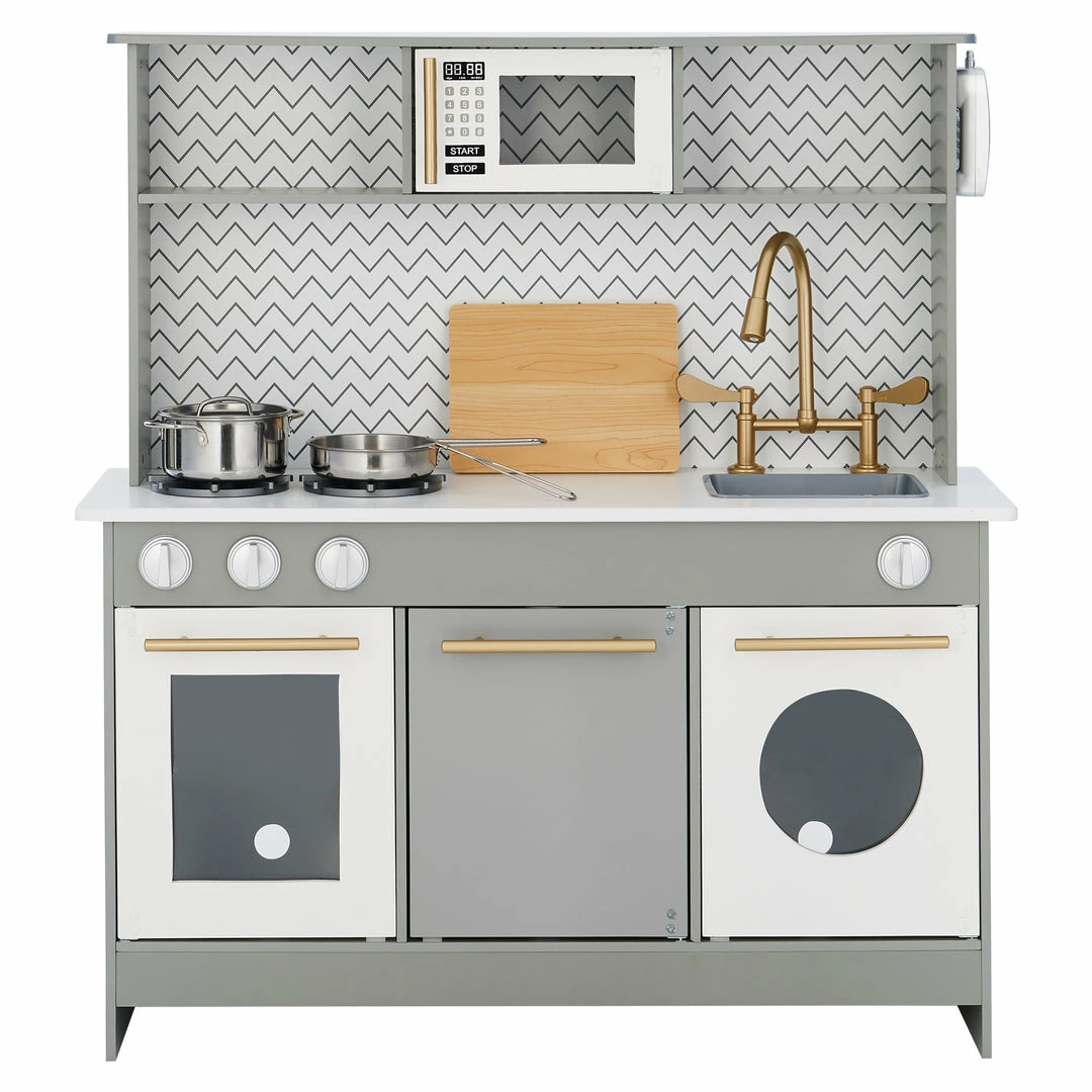 Give your little ones a kitchen of their own with the Teamson Kids Little Chef Berlin Classic Kids Kitchen Playset. This modern play kitchen is designed with a cool gray and white look with and gold accents, making it great for both boys and girls, and it completes any home, classroom, preschool, or daycare playroom. The functional and interactive design features openable oven and microwave doors, three turning oven knobs, two oven burners, two drawers, a sink with a gold faucet, and an under-sink cabinet to enhance your little ones play time. With 6 included accessories a cordless phone, spatula, pot, pan, lid, and chopping board this toddler kitchen encourages role play and lights up your little chefs imagination and creativity. The durable and eco-friendly MDF construction is kid-safe and easy to wipe clean with a damp cloth for every day messes. The easy-to-follow instructions allow for quick adult assembly so play time can start right away. This kid-sized toy kitchen measures 34″ x 11.75″ x 37″ and is recommended for children ages 3 years and up.