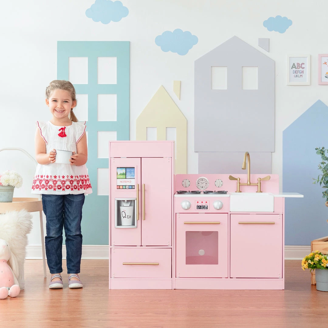 Help your little one create gourmet meals of their own with the Teamson Kids Little Chef Chelsea Modern Kids Kitchen Playset. This contemporary play kitchen is designed with a colorful pink finish and gold accents, making it great for both boys and girls. The functional design of this play kitchen includes opening oven and refrigerator doors, 4 turning oven knobs, 2 oven burners, a freezer with an ice maker, a sink, and an under-sink cabinet to make playtime more realistic. With charming details including a cup with ice cubes, a clock, and dials, this pretend play kitchen set sparks your little chefs imagination. The eco-friendly MDF construction of this play set is kid-safe and easy to clean for easy upkeep. Included step-by-step instructions allow for quick adult assembly so play time can start right away. This kid-sized toy kitchen measures 41.61″ x 11.81″ x 31.88″ and is recommended for children ages 3 years and up.