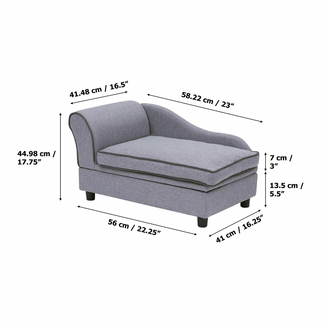 - INCLUDED: Chaise-style bed for cats and small dogs features one arm and a scalloped back, removable cushion, and hidden storage compartment underneath.
