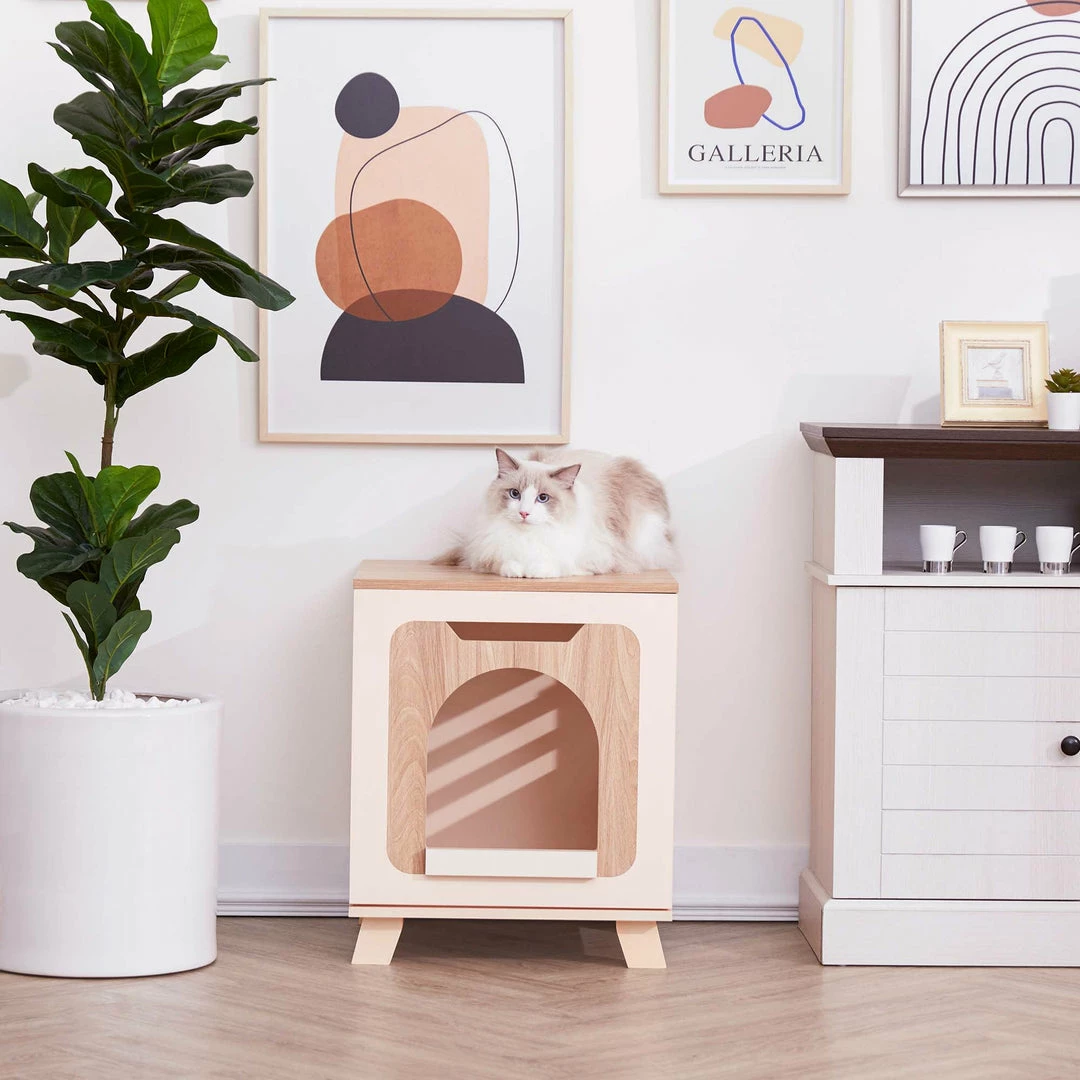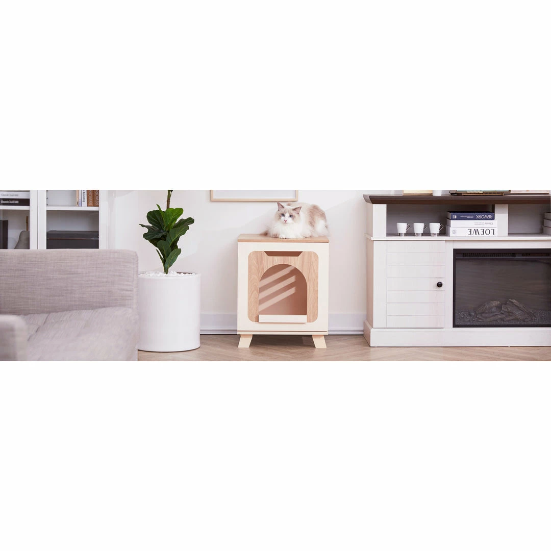 - INCLUDED: Two-toned mid-century modern enclosure that doubles as an end table and as a litter box, featuring splayed legs, easy-access entrance, easy-open door, and vented sides.