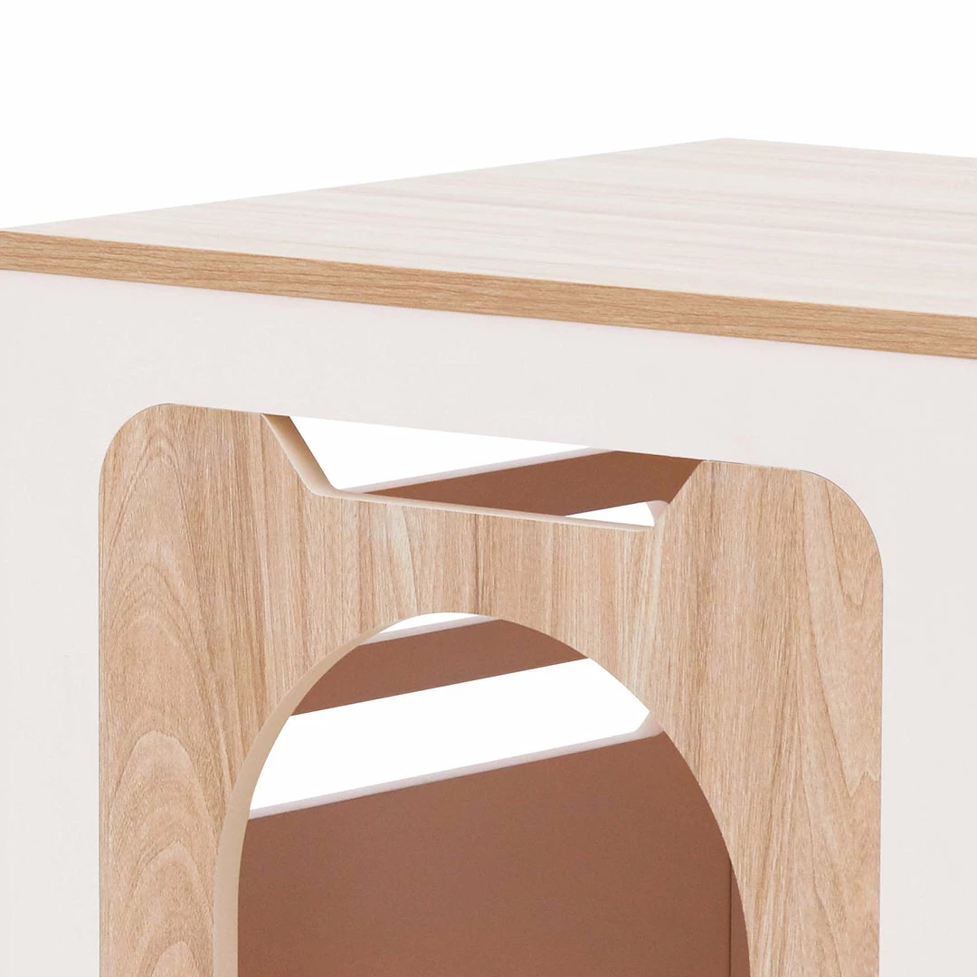 Bet you didn’t think a litter box could ever look this good! The Teamson Pets Daisy Elevated Vented Wooden Cat Litter Box proves you don’t need to sacrifice style for substance, even for the cat’s bathroom needs. Adorably styled with two-toned white and brown wood highlighting a subtle kitty ear entrance and mid-century chic splayed legs, Daisy not only doubles as an end table, but its enclosed frame keeps messes discreet and hidden.